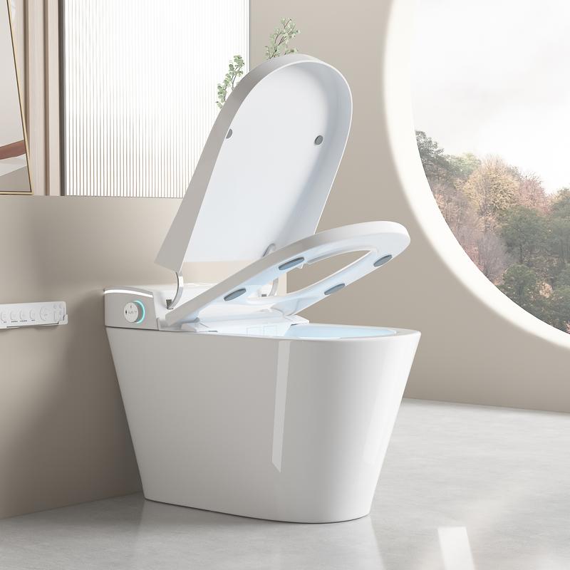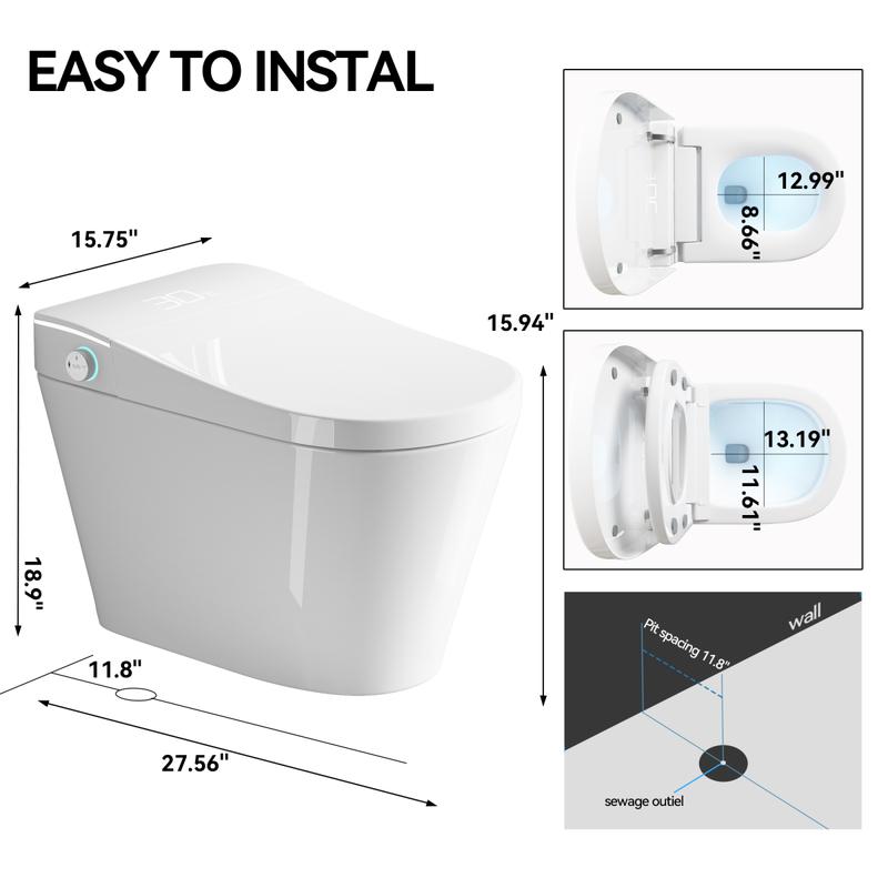 Product Specifications Basic Information Item Code: W3133P414562 Product Type: Single Box Product Product Name: Unique Smart Toilet, One Piece Toilet with Bidet Built In, Intelligent Toilet Auto Open/Close Seat Bidet toilet with Dryer and Warm Water. WHITE color: White material: Ceramic Product Size Assembled length (inches): Not Applicable Assembly Width (inches): Not Applicable assembly height (inches): Not Applicable Product Weight (pounds): Not Applicable Packaging Size Length (inches): 32. 68 Width (inches): 20. 87 Height (inches): 26. 00 Weight (pounds): 102. 30 Product Features Experience hands-free operation as the seat lid automatically opens upon approach and soft- closes when you leave, eliminating the need for manual adjustments. Utilizing Siphonic jet, our smart toilet combines siphoning and jet flushing to reduce waste accumulation and maintain cleanliness. The built-in battery design ensures normal flushing even during power outages Designed for comfort and convenience, our smart toilet offers instant warm water, warm air drying, night light, heated seat, LED display, seat temperature adjustment, auto. flush, enhancing the overall user experience. Choose from multiple flushing methods including off-seat flushing, button control flushing, foot sensor flushing, and remote control flushing for a hands-free operation. 1x Bidet Toilet with Hose and Components Pre-installed - 1x Wireless remote control (Equipped with a backup battery : Remote control battery No.7 Toilet spare battery 9V) Multiple Washing Modes :Experience Bidet washing, Experience women washing, rear washing, move washing, and self-cleaning options to cater to a variety of needs and ensure the health and cleanliness of your family.
