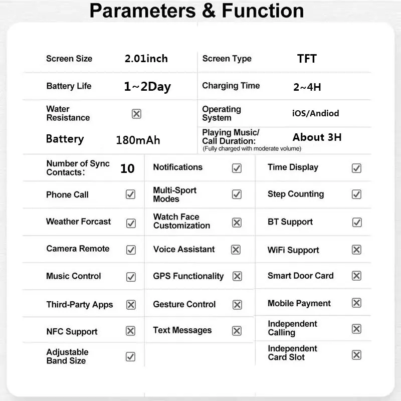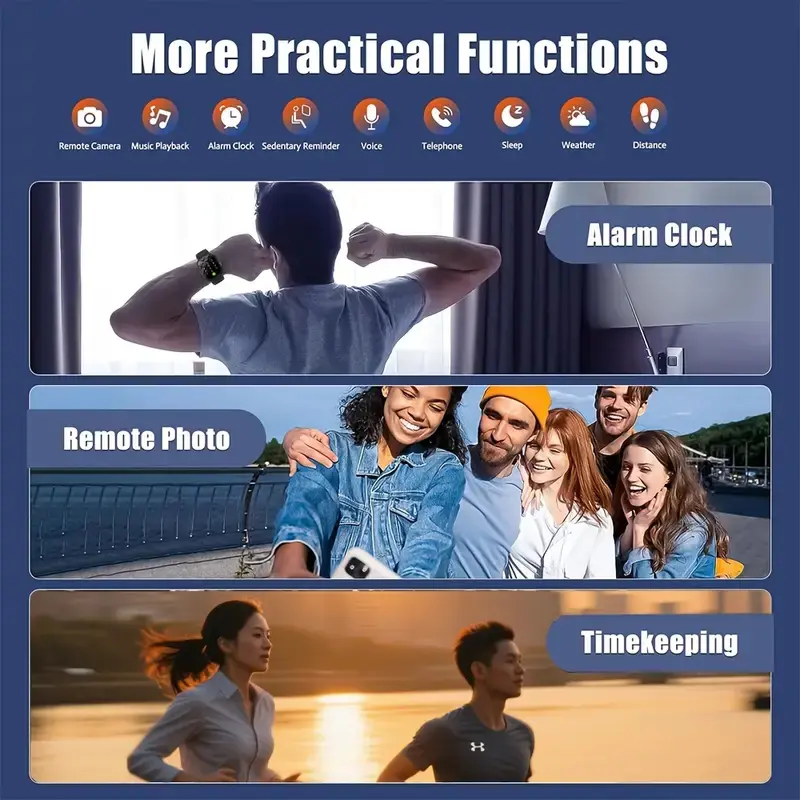 Ever wish you could keep your phone in your pocket but never miss a call or message? This smartwatch with Bluetooth calling and message alerts makes it easy to stay connected on the go. Whether you're running, cycling, or just chilling, the multi-sport modes help you track your fitness effortlessly. The vibrant 2.01-inch HD screen shows your custom wallpaper and important info clearly, with an always-on display for quick glances. Powered by a 180mAh battery, it offers 2-3 days of active use and up to a week on standby, so you’re not charging every day. Plus, handy features like remote camera control, music playback, weather updates, and sedentary reminders make daily life smoother. The sleek metal case and comfy silicone strap come in stylish pink or black, fitting all wrists with a one-size design. Inside the box, you'll find the smartwatch with built-in battery ready to go. Compatible with both iPhone and Android, this watch is your perfect everyday companion. Ready to upgrade your wrist game? Grab yours and stay connected in style!