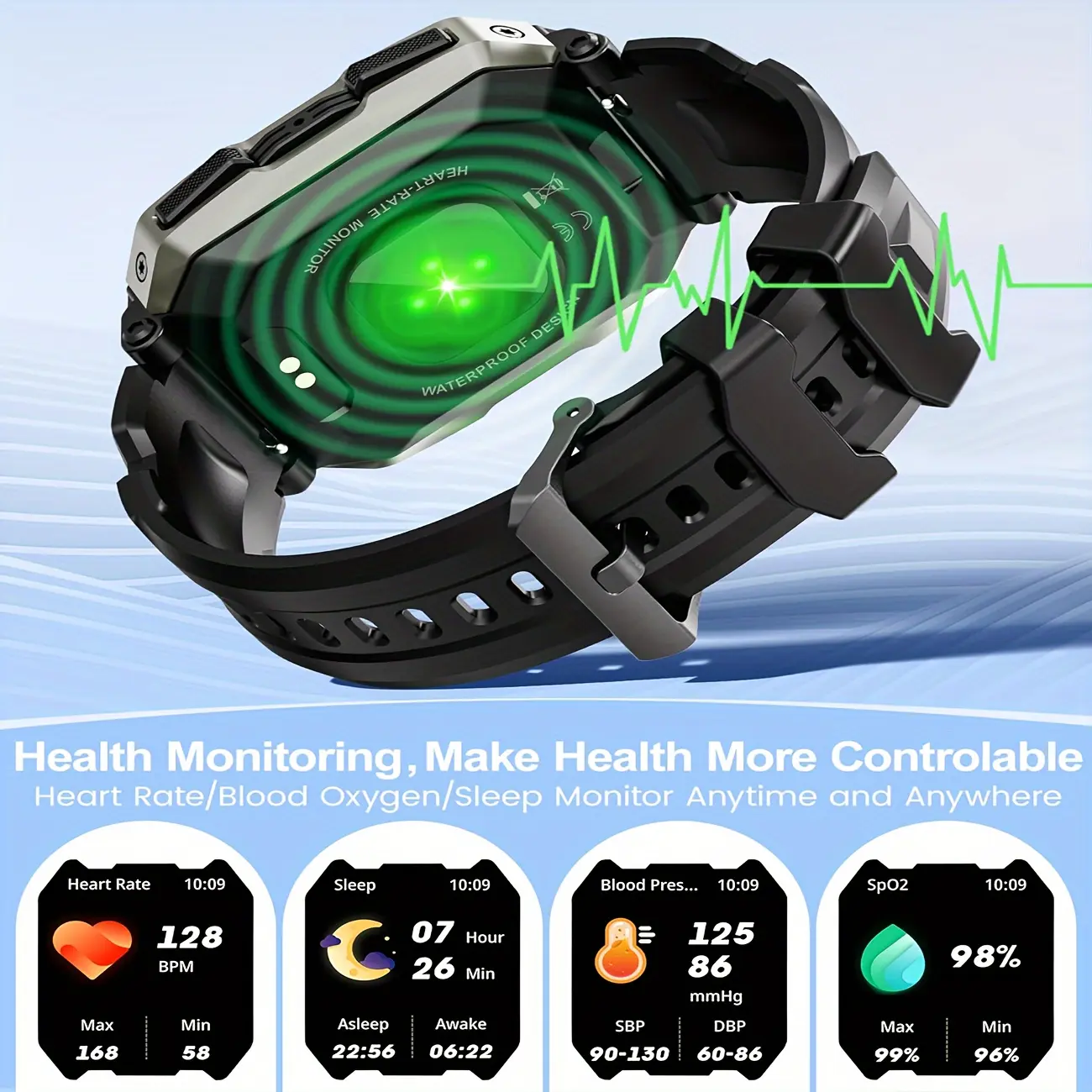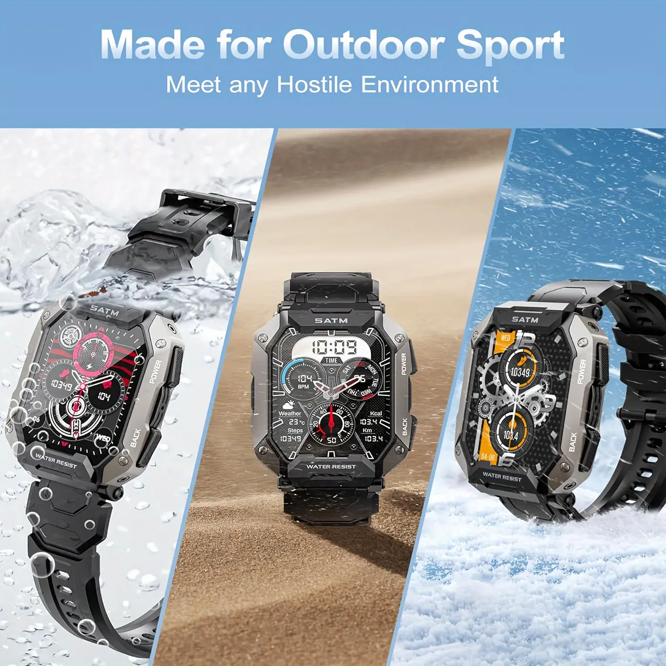 ·Rugged & Waterproof: This smart watch are made of rugged and wear-resistant materials, and have been rigorously tested many times to successfully pass the test of rain, snow, low temperatures and other inclement weather, which is suitable for people in various fields, and the IP68 waterproof watch can be easily submerged into 100M deep water (static).