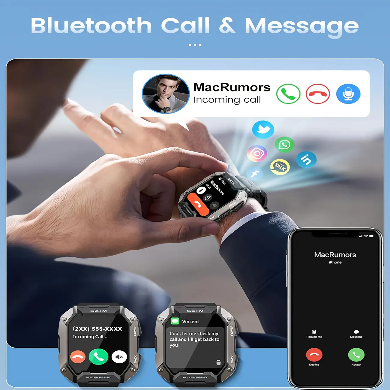 ·Bluetooth Call: With Bluetooth 5.3, this mens smart watch can not only make and answer calls but also receive messages from your phone. Our bluetooth watch can also receive information from various social media outlets on your phone, completely freeing up your hands while allowing you to not worry about missing any important information.