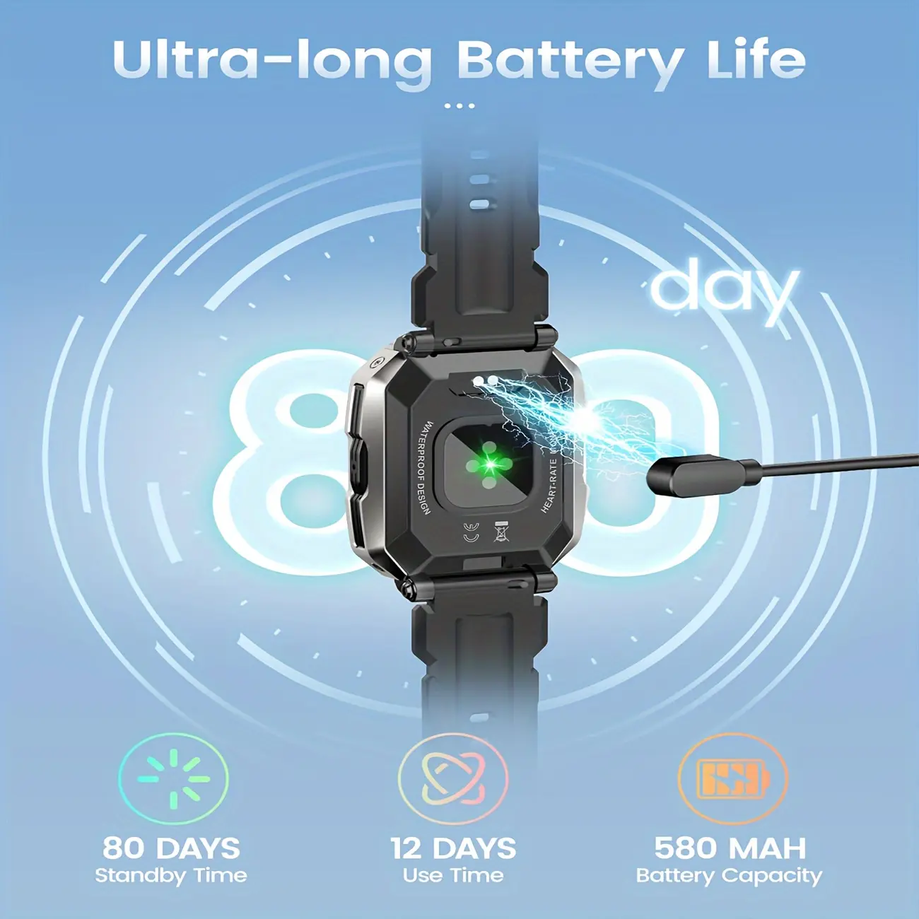 ·Ultra-long Battery Life: This smartwatch redefines longevity with its large 580mAh battery that delivers up to three times the performance and longevity of traditional batteries. 1.5 hours of fast charging is enough to last for 80 days of use for both Android and iOS. With our smart watch for men, bid farewell to battery anxiety and embrace uninterrupted productivity and performance.