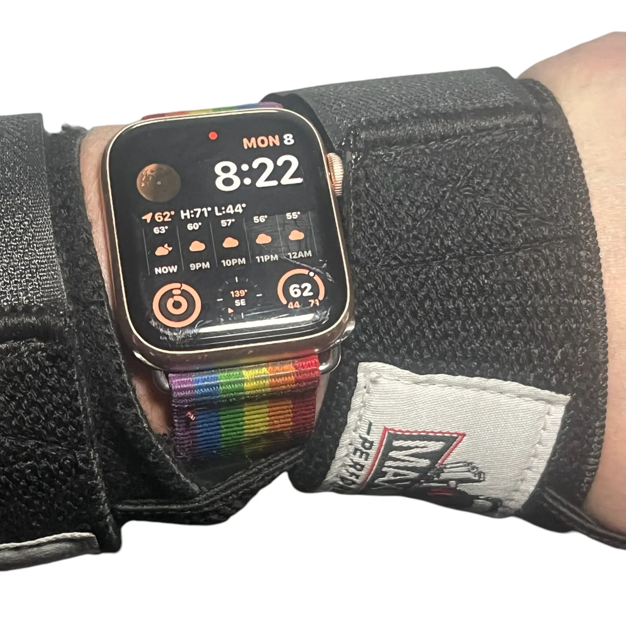 These wraps are the same size as the traditional 3" wrist wraps but has a unique split feature. There is a 1" gap between to accommodate all brands of watches so that you can continue to track heart rate, calories, steps, reps and more, while giving you the support you need to crush your PRs.