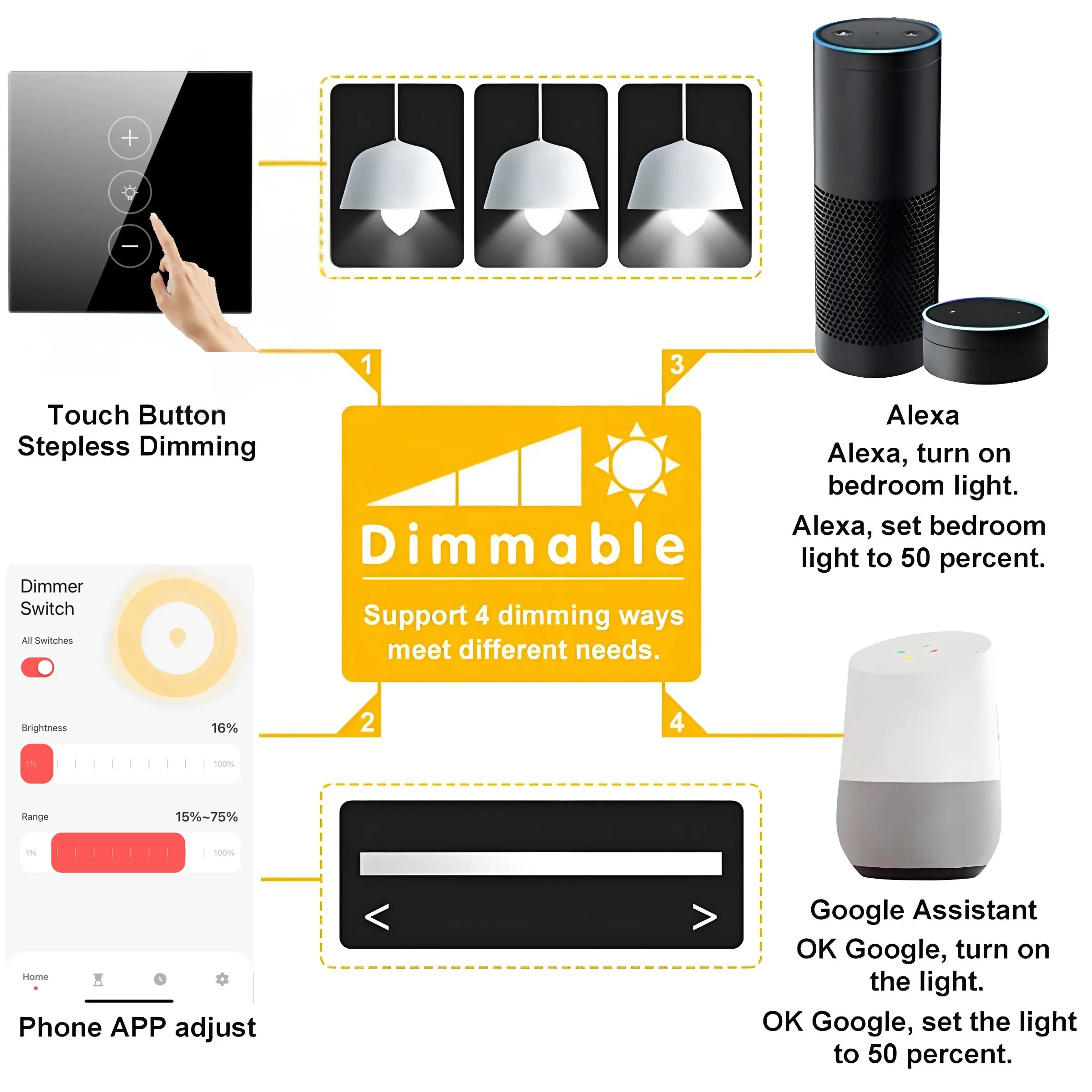 ✦ Adjust brightness from 1 to 100%: freely adjust the brightness level of the light with the percentage control function of the WiFi Alexa dimmer, which solves the problem that the lights are too bright and it wastes too much energy.