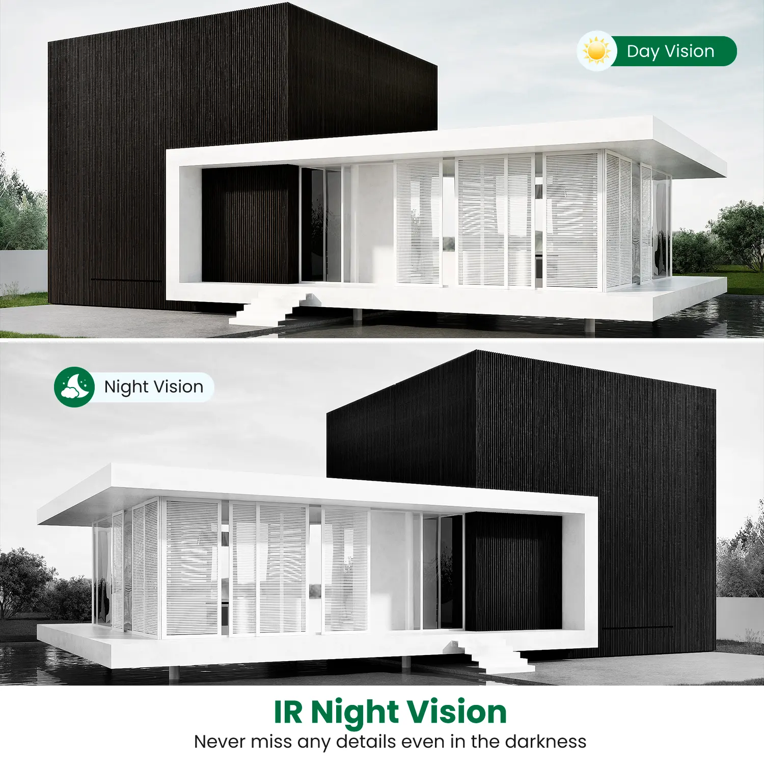 Advanced Night Vision Technology: Six infrared lights and a smart IR sensor deliver crystal-clear, high-resolution videos in low-light environments, 24/7.