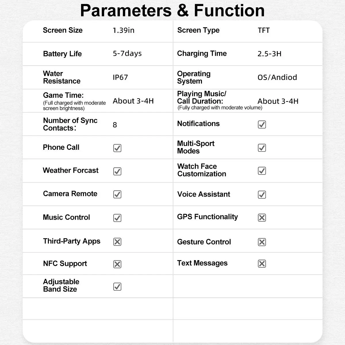 Ever wished your watch could do more than just tell time? Meet the LIFEBEE Multifunctional Smart Watch, designed to keep you connected and active without missing a beat. Whether you're juggling calls, tracking your fitness goals, or just want to customize your style, this smartwatch has your back. With its crisp 1.39-inch TFT touchscreen and vibrant 360x360 resolution, checking notifications and switching watch faces is a breeze. The IP67 waterproof design means you can wear it worry-free during workouts or rainy days, though swimming is a no-go. Choose from over 100 exercise modes to monitor steps, calories, and distance, making every workout count. Plus, the built-in voice assistant and mini games add a fun twist to your daily routine. Sync up to 8 contacts for quick calls and get timely reminders to stay hydrated or move around. The adjustable silicone band ensures a comfy fit for all-day wear. Inside the box, you'll find everything you need: the smartwatch, charging cable, and an easy-to-follow user manual. Ready to upgrade your wrist game? Grab your LIFEBEE smartwatch today and stay stylishly connected wherever life takes you!