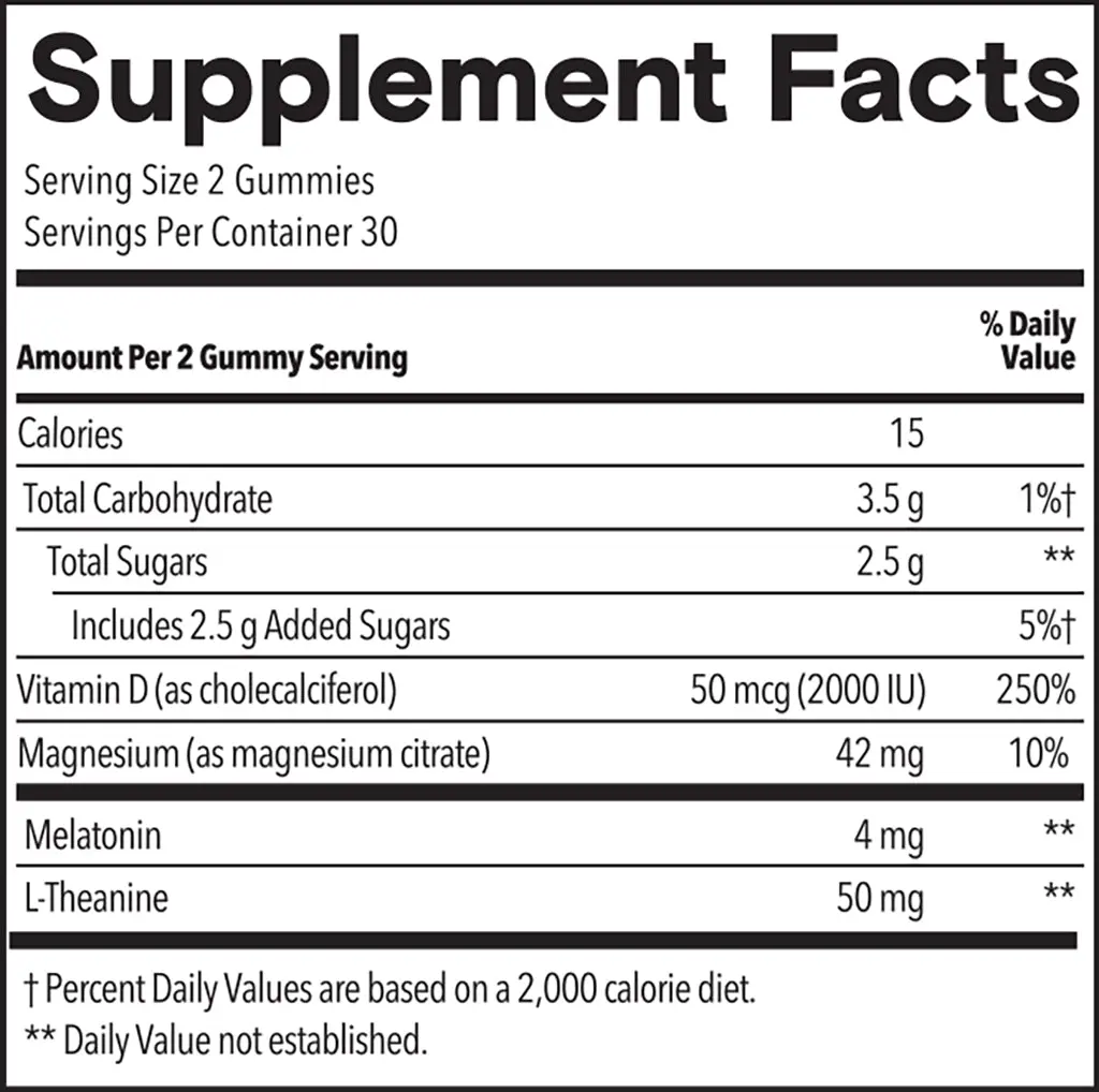 IngredientsVitamin D,Melatonin,L-Theanine,Organic Tapioca Syrup,Organic Cane Sugar,Pectin,Natural Flavors,Citric Acid