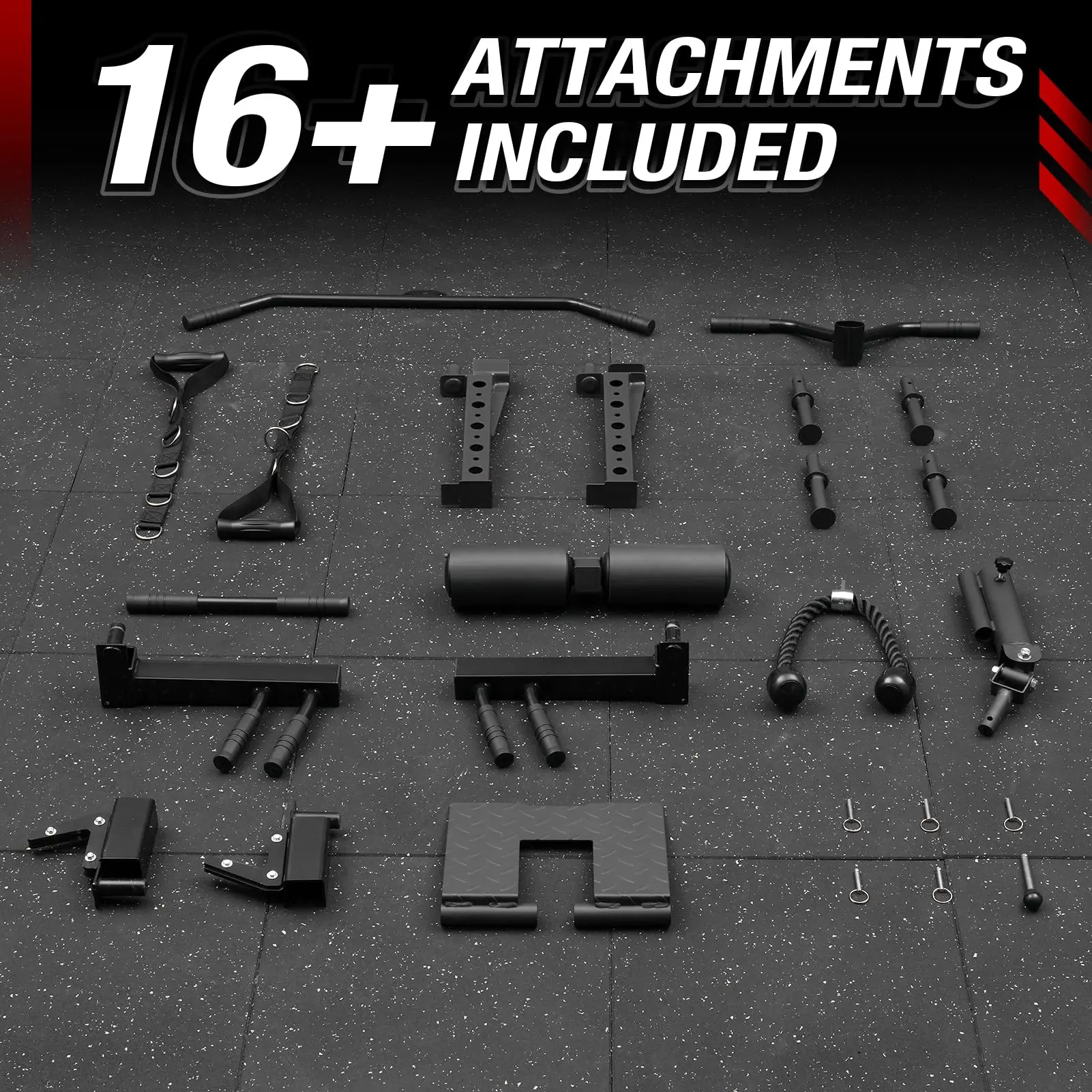·[Fully Equipped & Varied]: Equipped with multiple accessories, except the additional leg hold down attachment, t bar row platform with t bar, battle anchor, it also includes 4 free handle attachments, 2 (safety spotter arms, dip attachments, j hooks), footboard, pull-up bar, etc.