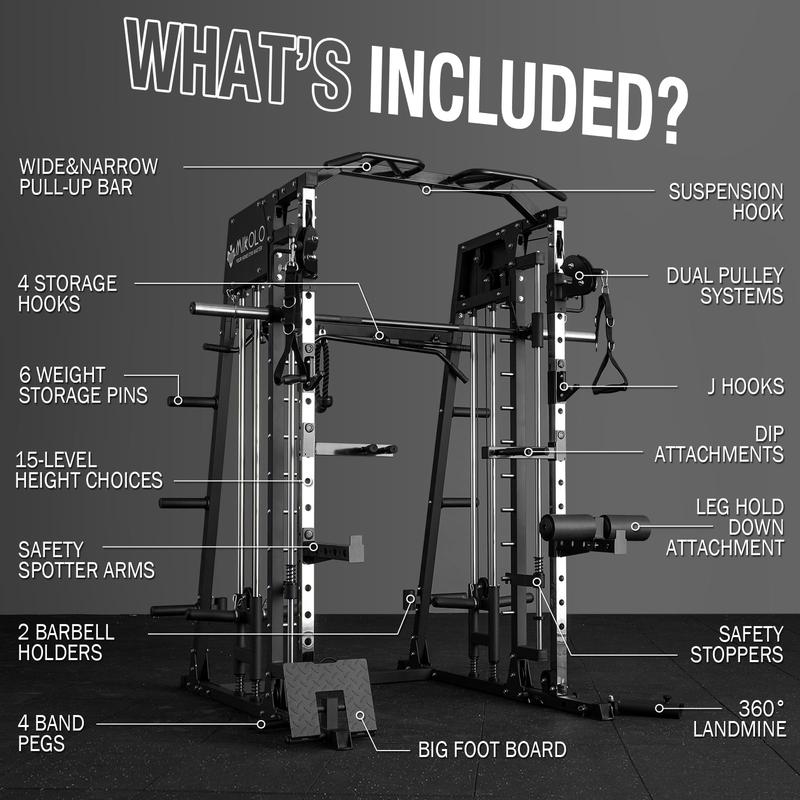 Β·[Fully Equipped for Variety]Comes with a wide range of accessories: safety spotter arms, j-hooks, dip attachments, pull-up bar, footboard, 4 handle attachments, T-bar row platform, battle rope anchor, and a leg hold-down for lat pulldowns. Everything you need in one machine.