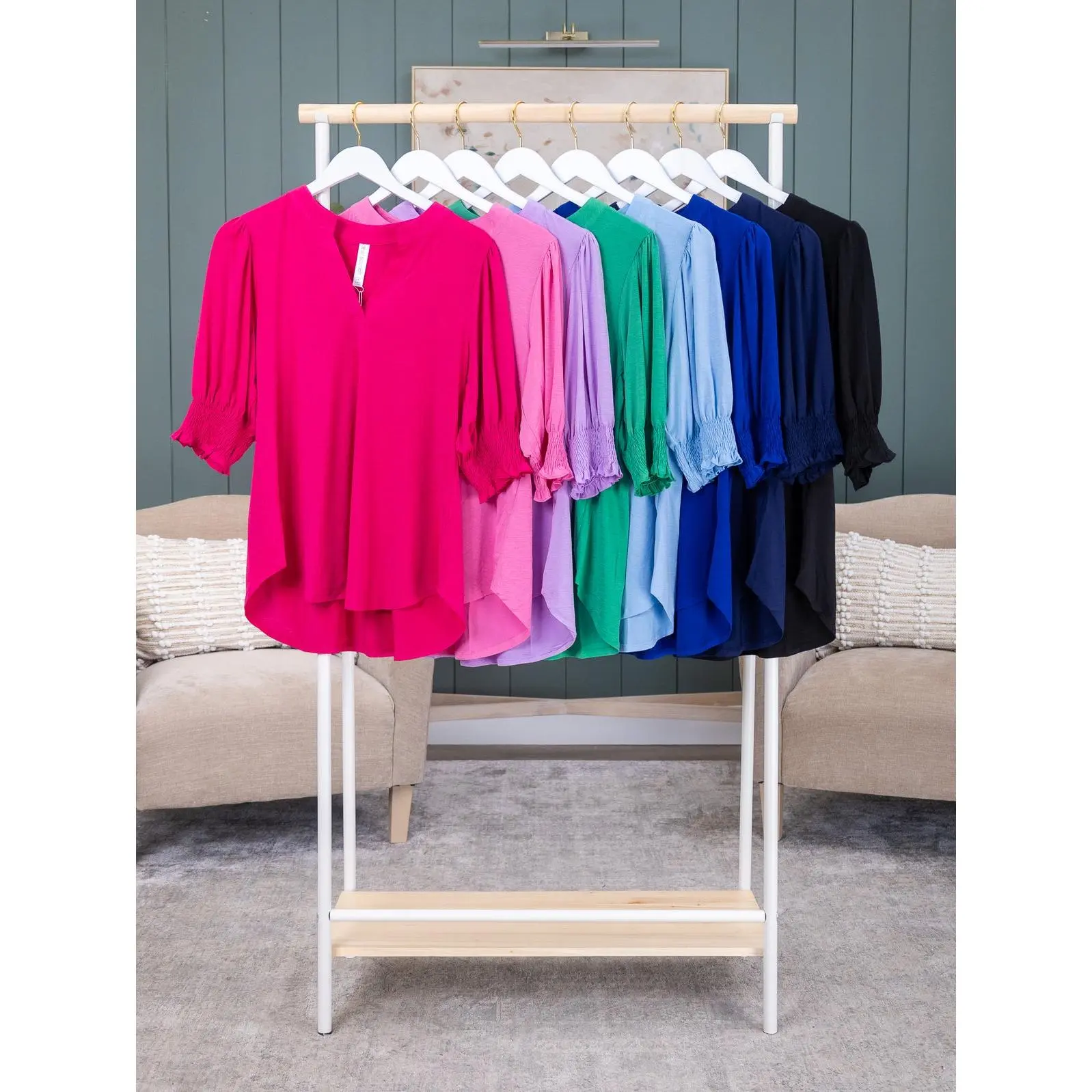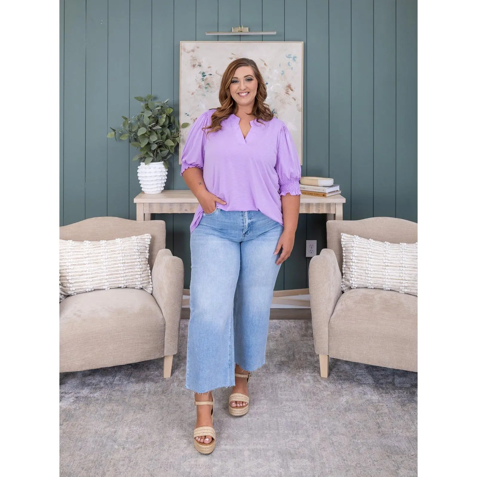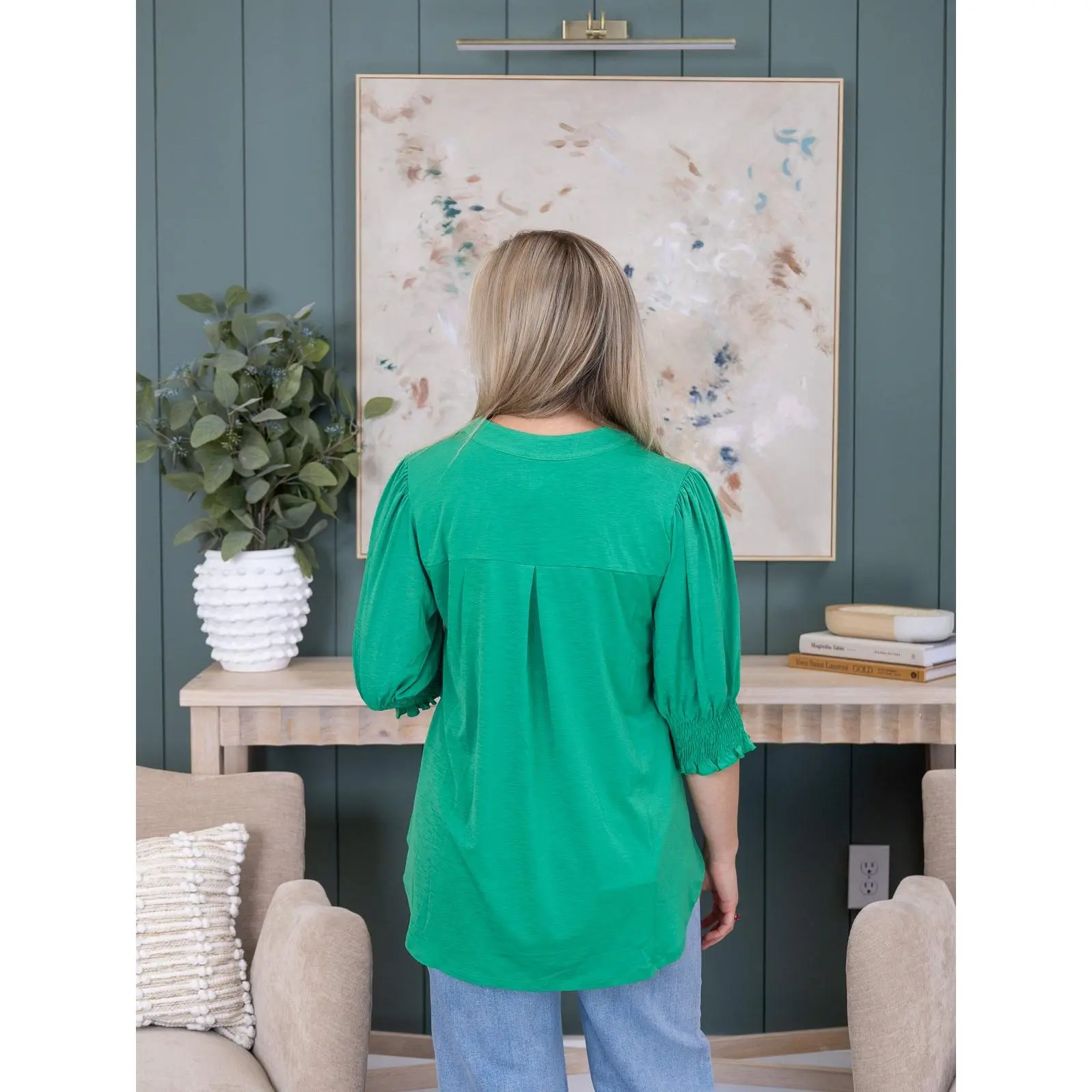 Erin is 5'8, 36C bra, typically wears size L/XL in tops and 14/15 in denim. Wearing size XL. Brittany (short blonde hair) is 5'10, 36B bra, typically wears size S in tops and 3/5 in denim. Wearing size S. Crimsen (long blonde hair) is 5'1, 34B bra, typically wears size S in tops and 3 in denim. Wearing size S. Features: V Neck, Smocked 3/4 Sleeve, Wrinkle Free, Solid Top Medium Measurements: Bust- 39" / Length- 26" 2XL Measurements: Bust- 49" / Length- 28" Materials: 94% Polyester 6% Spandex Brand: Dear Scarlett SKU 58462