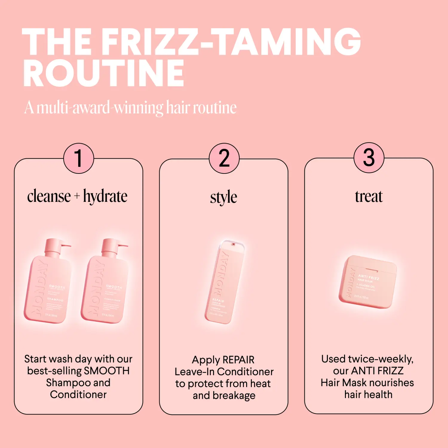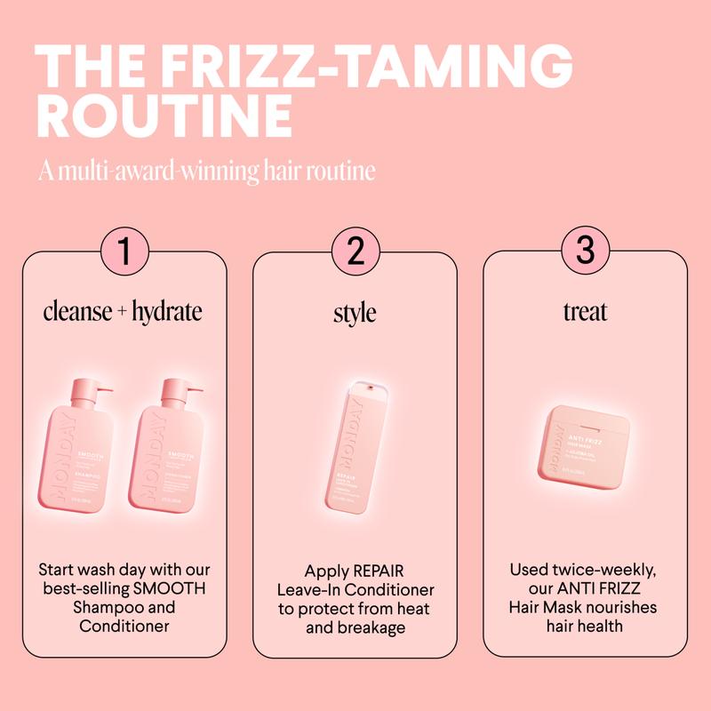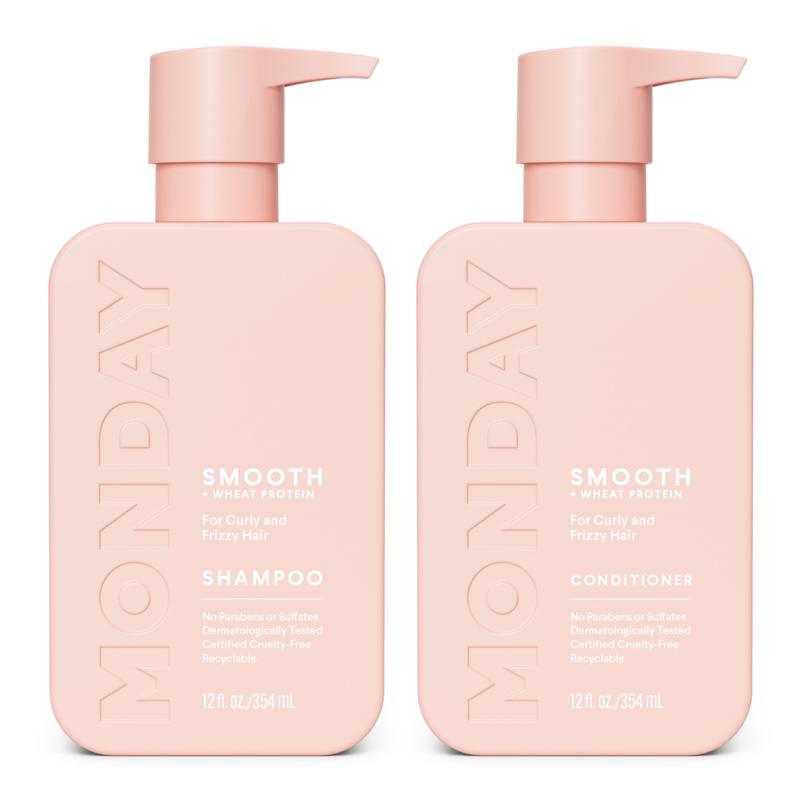 MONDAY Haircare SMOOTH Shampoo and Conditioner set for women is good for frizzy and unmanageable hair and curly and wavy hair types. It’s also safe for color-treated hair. This defrizzing Shampoo and Conditioner helps to soften and smooth hair with Coconut Oil, Shea Butter and Vitamin E—ingredients that help support hair health and maintain normal hair growth and thickness.