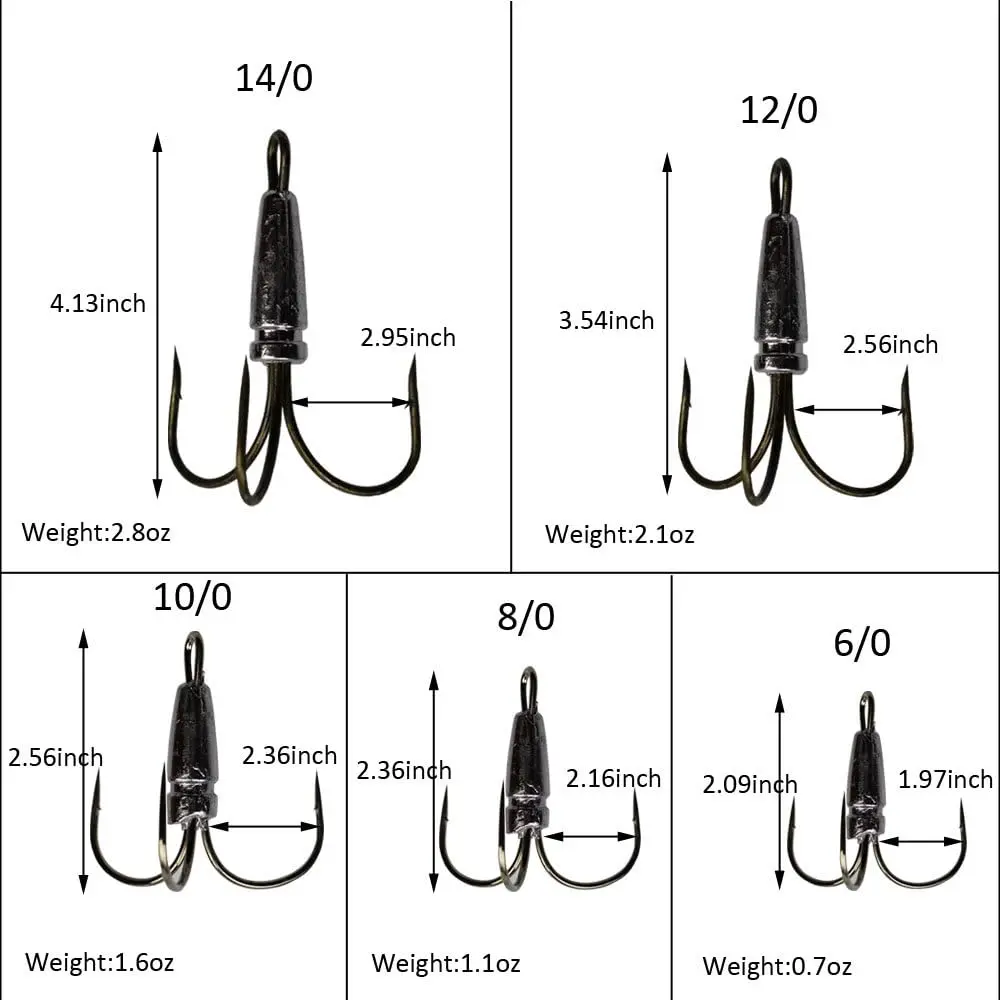 2pcs snagging treble fishing hooks12/0 and 14/0 is tea color; 6/0, 8/0, 10/0 is silver colorSize details:SizeLengthWeight6/02.09inch0.7oz8/02.36inch1.1oz10/0~2.56inch1.6oz12/0~3.54inch2.1oz14/0~4.13inch2.8ozLaxygo: any question please contact us directly!We will take full responsibility for any quality problems within 30 days. We adhere to amazon return policy!