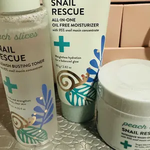 | Ingredients | Snail Rescue Blemish-Busting Toner:Snail Secretion Filtrate, Propanediol, 1,2-Hexanediol, Hydrolyzed Hyaluronic Acid, Sodium Hyaluronate, Hyaluronic Acid, Centella Asiatica Extract, Xanthan Gum, Sodium Citrate, Ethylhexylglycerin, Citric Acid, Tocopherol Snail Rescue Oil Free Moisturizer: Snail Secretion Filtrate, Cetyl Ethylhexanoate, 1,2-Hexanediol, Betaine, Water, Centella Asiatica Extract, Hydrolyzed Hyaluronic Acid, Sodium Hyaluronate, Hyaluronic Acid, Betula Alba Juice, Fragaria Chiloensis (Strawberry) Fruit Extract, Sodium Carbomer, Propanediol, Sorbitan Olivate, Cetearyl Olivate, Butylene Glycol, Disodium EDTA, Phenoxyethanol Snail Rescue Intensive Wash-Off Mask:Snail Secretion Filtrate, Ammonium Acryloyldimethyltaurate/Beheneth-25 Methacrylate Crosspolymer, 1,2-Hexanediol, Centella Asiatica Extract, Glycyrrhiza Glabra (Licorice) Root Extract, Hydrolyzed Hyaluronic Acid, Sodium Hyaluronate, Hyaluronic Acid, Water, Fragaria Chiloensis (Strawberry) Fruit Extract, Sodium Polyacrylate Starch, Betula Alba Juice, Propanediol, Butylene Glycol, Disodium EDTA, henoxyethanol |