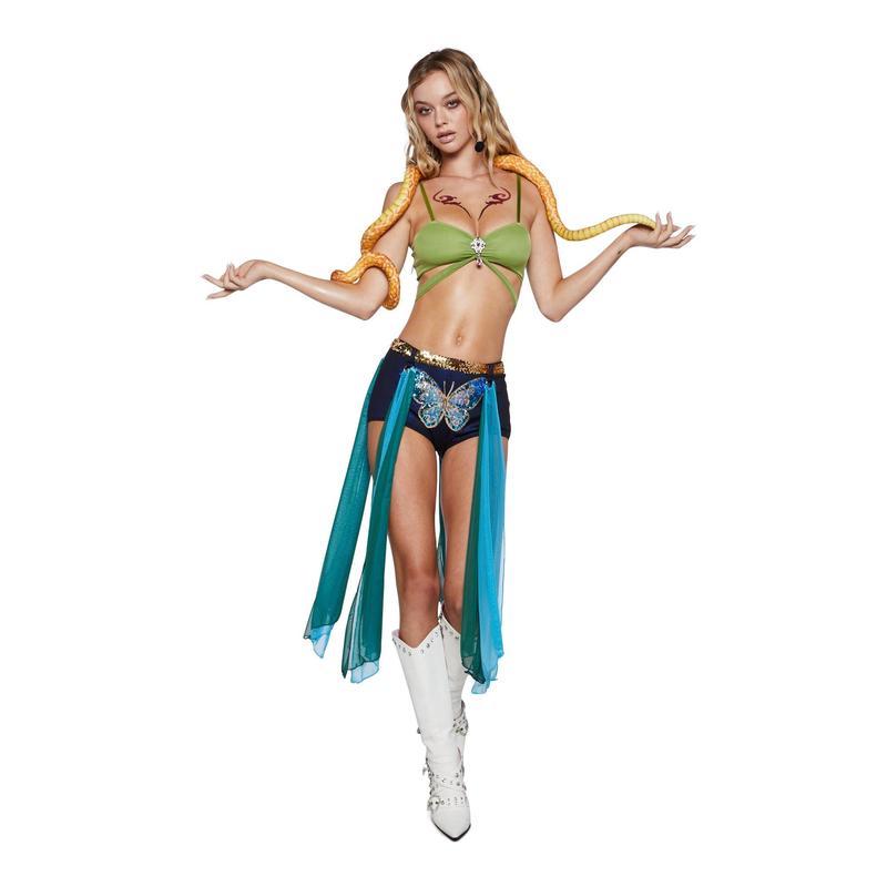 don't deny it, don't try to hide it. This costume set includes a stretchy mesh bra top with adjustable shoulder straps, a gem embellishment at center, and adjustable back ties, shimmery mid-rise hot pants with a sequin belt, butterfly applique, and long mesh detailing, a plush snake, and a temporary tattoo sheet. It's perfect for themed parties, cosplay, or a bold Halloween statement.