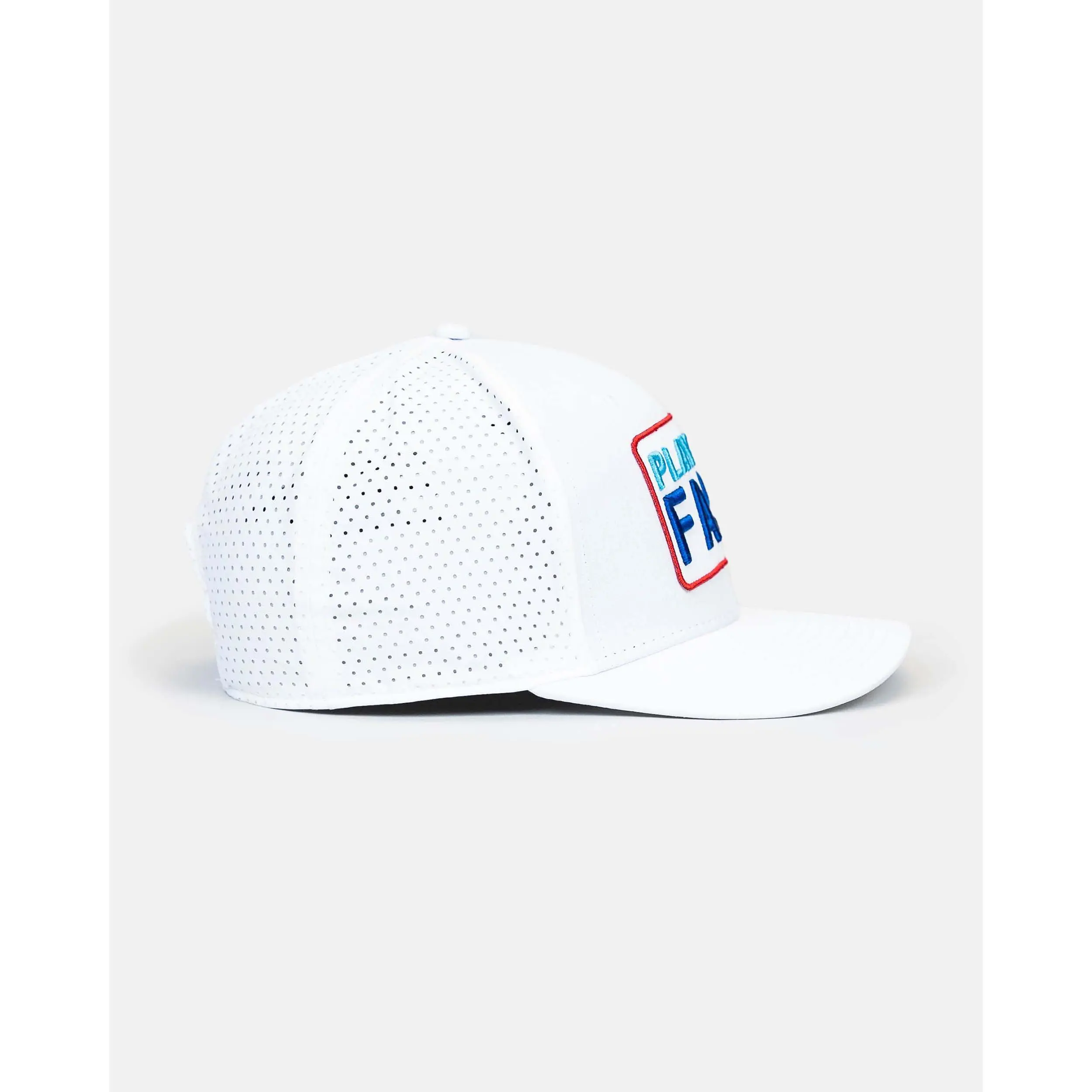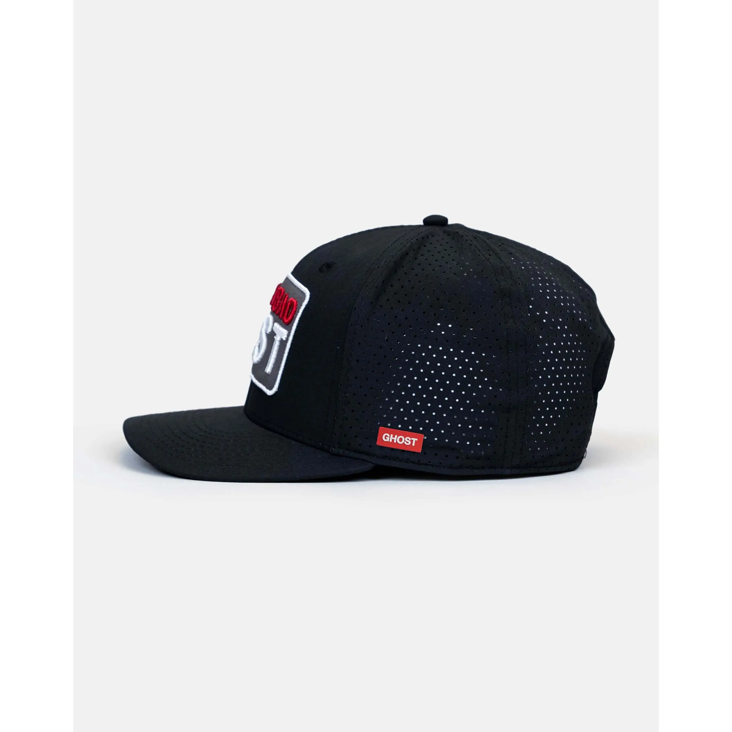 Style: 6-panel structured ultra-fit hat with an embroidered patch featuring raised letters and a perforated pattern on the side panels.