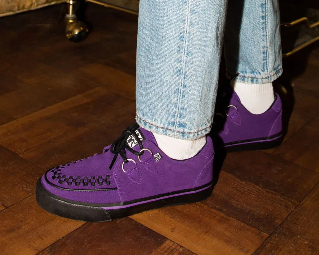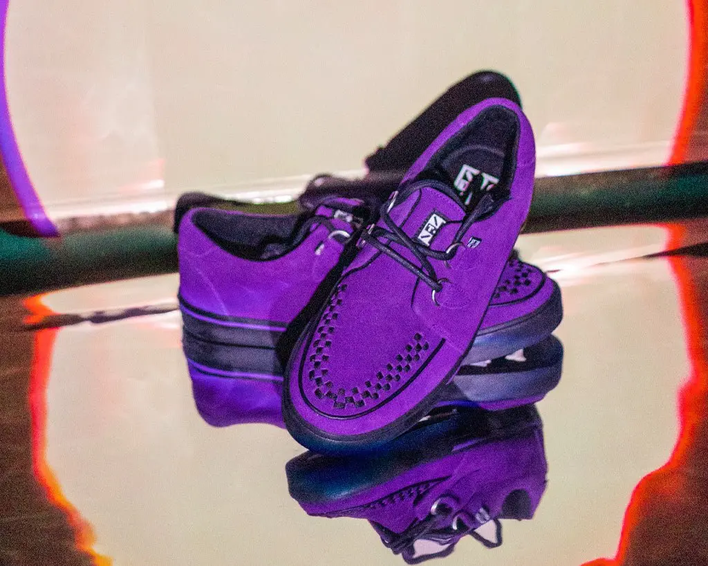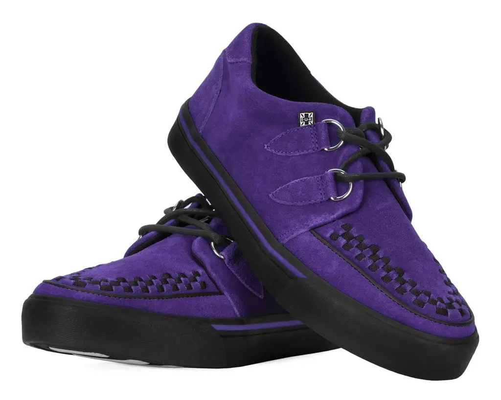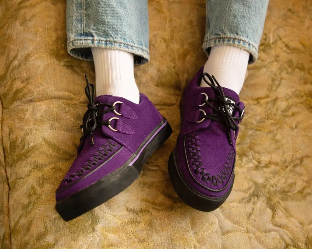 Normal is boring! Get ready to hit the stage or the streets in these vulcanized sneakers that reimagines our former creeper sneaker silhouette with bold & modern twists. Features one of our crowd-pleasing upper styles of purple cow suede with classic D-rings & iconic interlace detailing along the front.