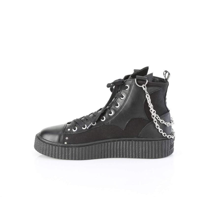 1 1/2" (38mm) Platform Rubber Sole High Top Round Toe Lace-Up Front Creeper Sneaker, Contrast Bat Detail on Side Panels and Tongue, Tiered Hanging Chain Detail