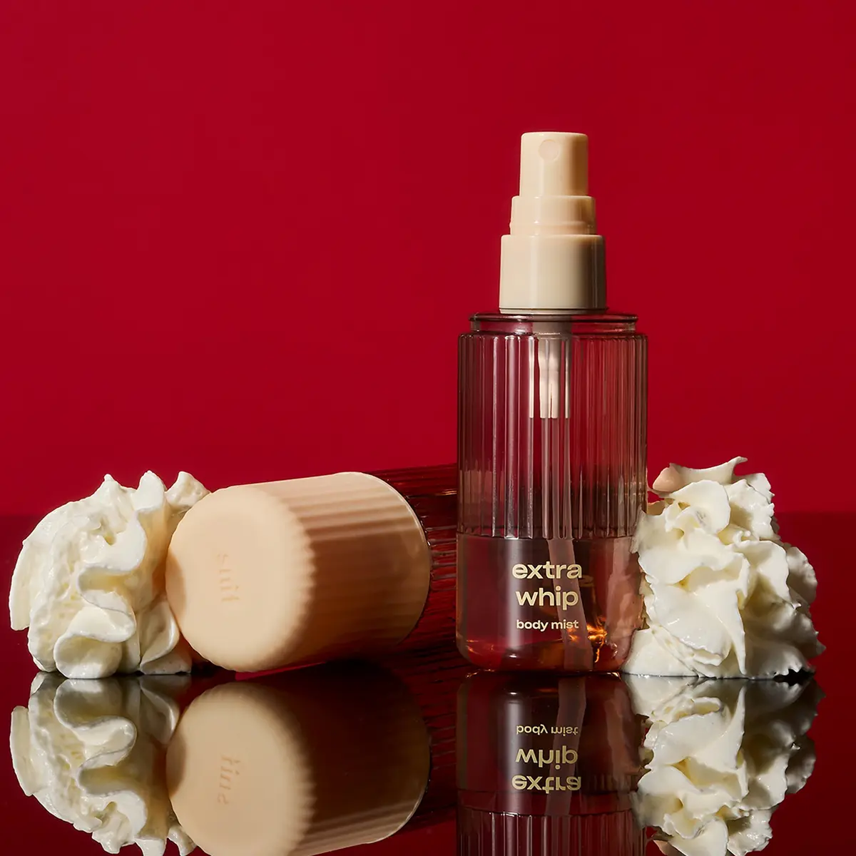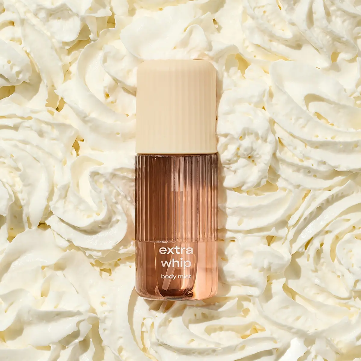 Extra Whip Body Mist is cooler than whipped cream straight from the can with a nostalgic blend of icing sugar, vanilla, and cold aldehydes with milky sandalwood, and fluffy musk.
