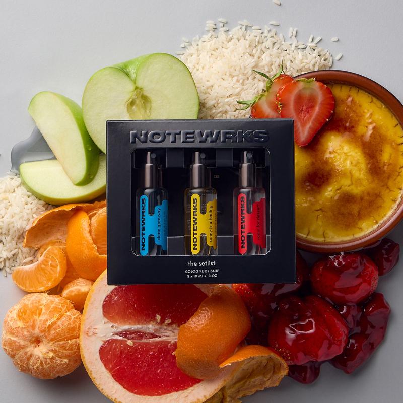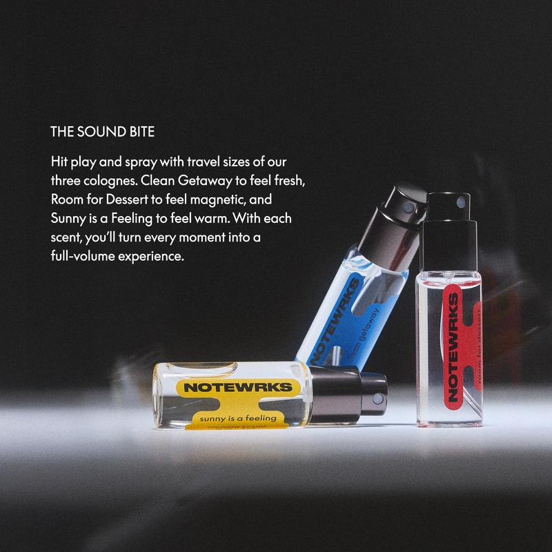Hit play and spray with travel sizes of our three colognes. Clean Getaway to feel fresh, Room for Dessert to feel magnetic, and Sunny is a Feeling to feel warm. With each scent, you’ll turn every moment into a full-volume experience.