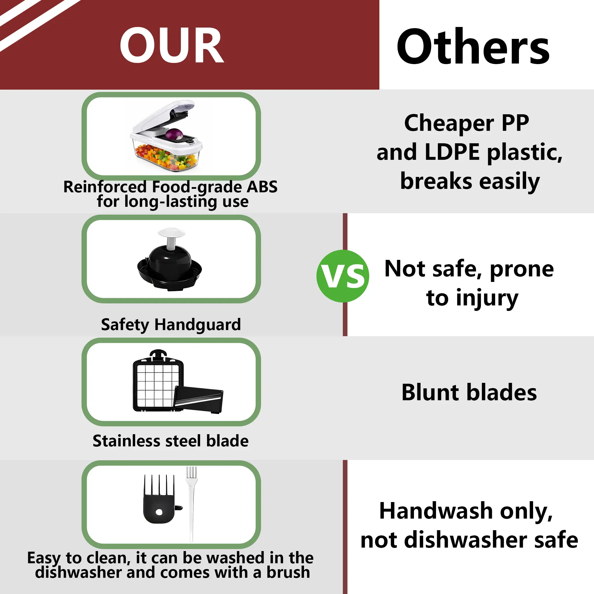 ·【EXCELLENT QUALITY】:The vegetable shredder blade is made of durable ABS and 420J2 stainless steel, ensuring it won't rust. It efficiently chops, dices, and slices fruits, vegetables, and cheese with precision.The all-in-one chopper features a sharp hardened stainless steel blade that reduces clutter while cutting accurately. Equipped with a non-slip base for stable fixation on the tabletop during use, it effectively prevents accidental sliding and injuries—providing you with a safer kitchen experience