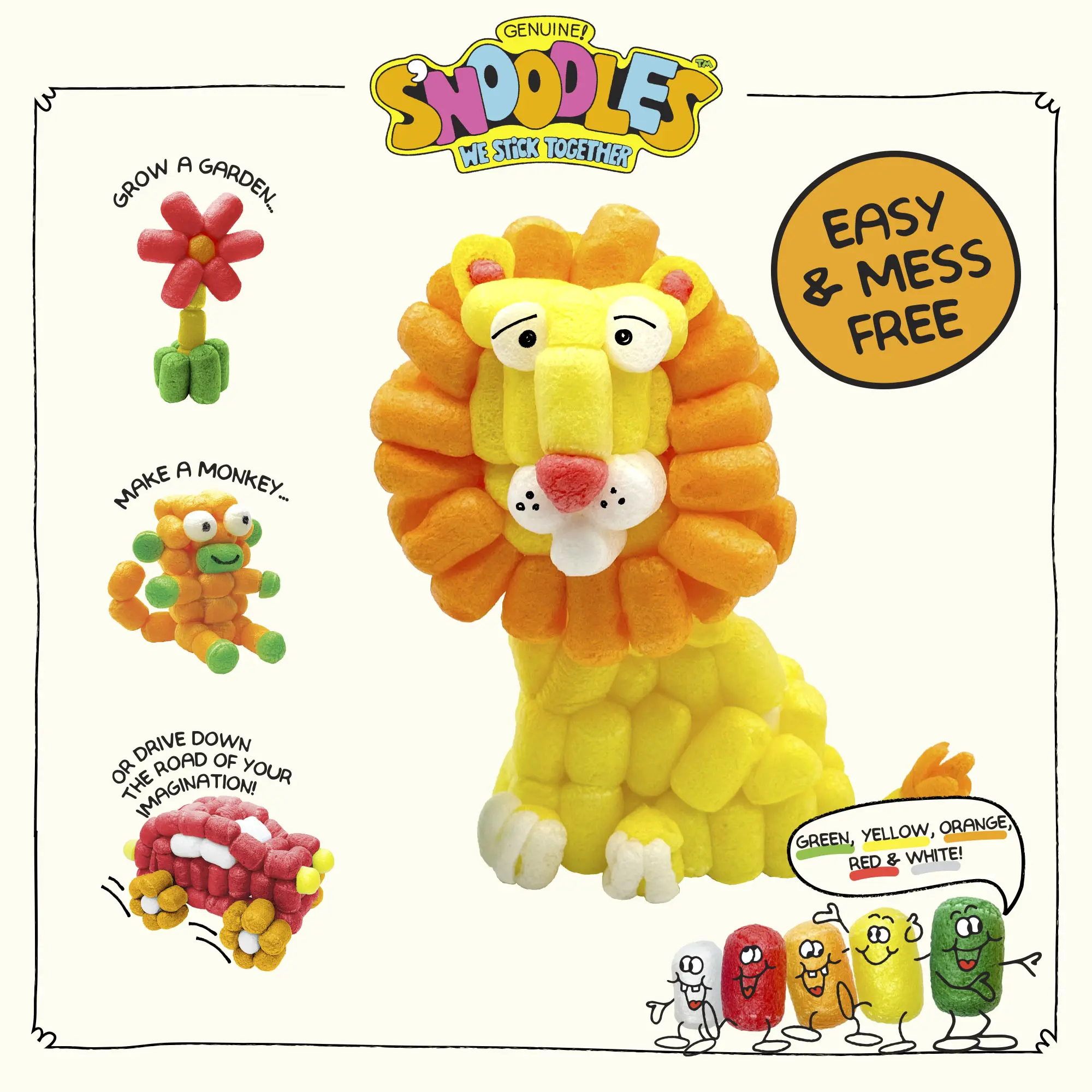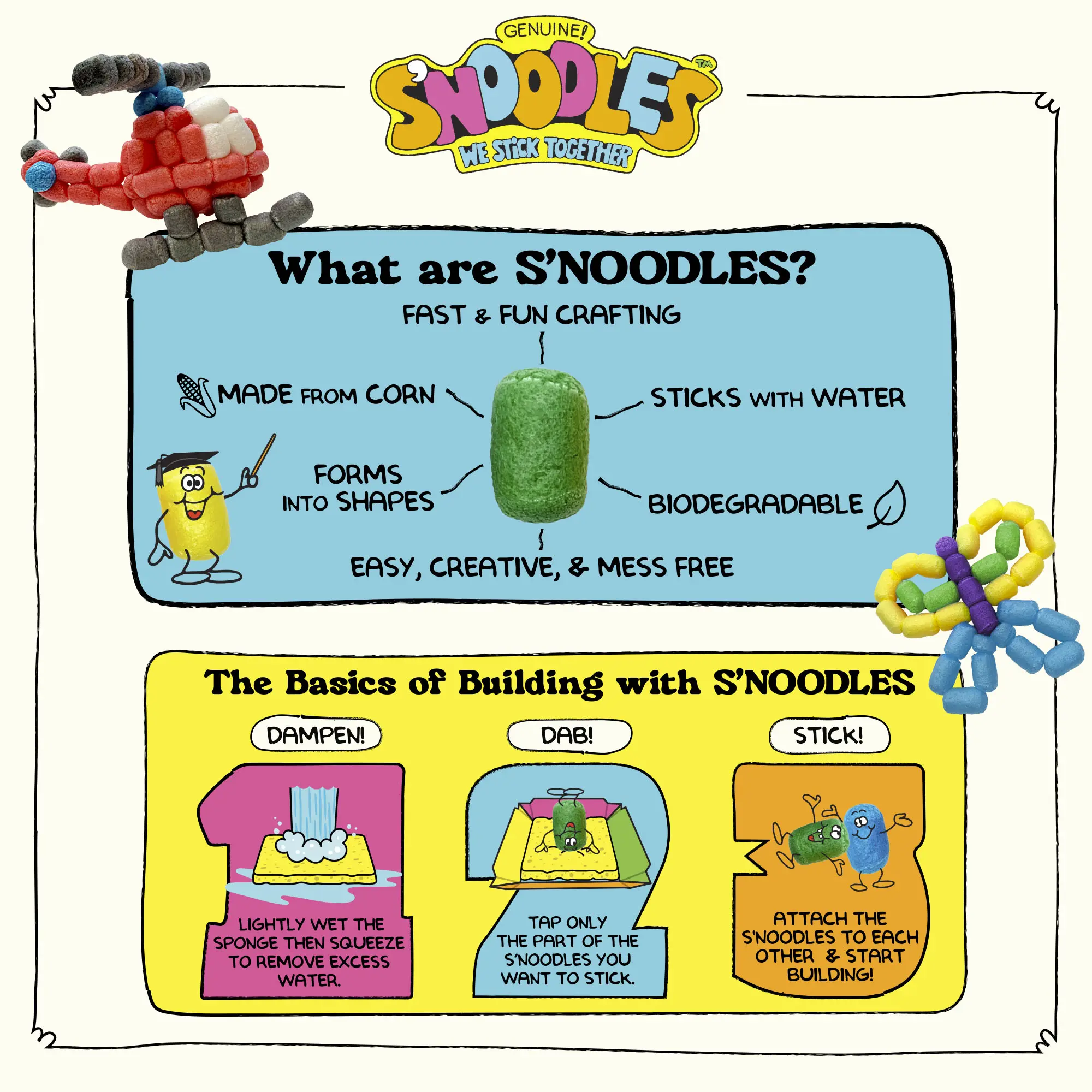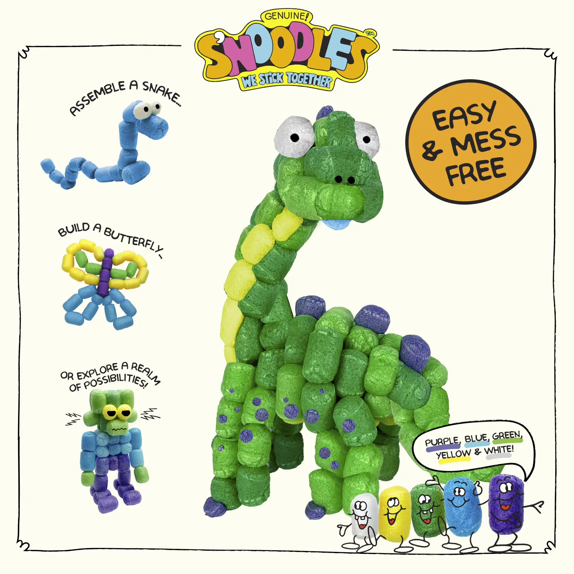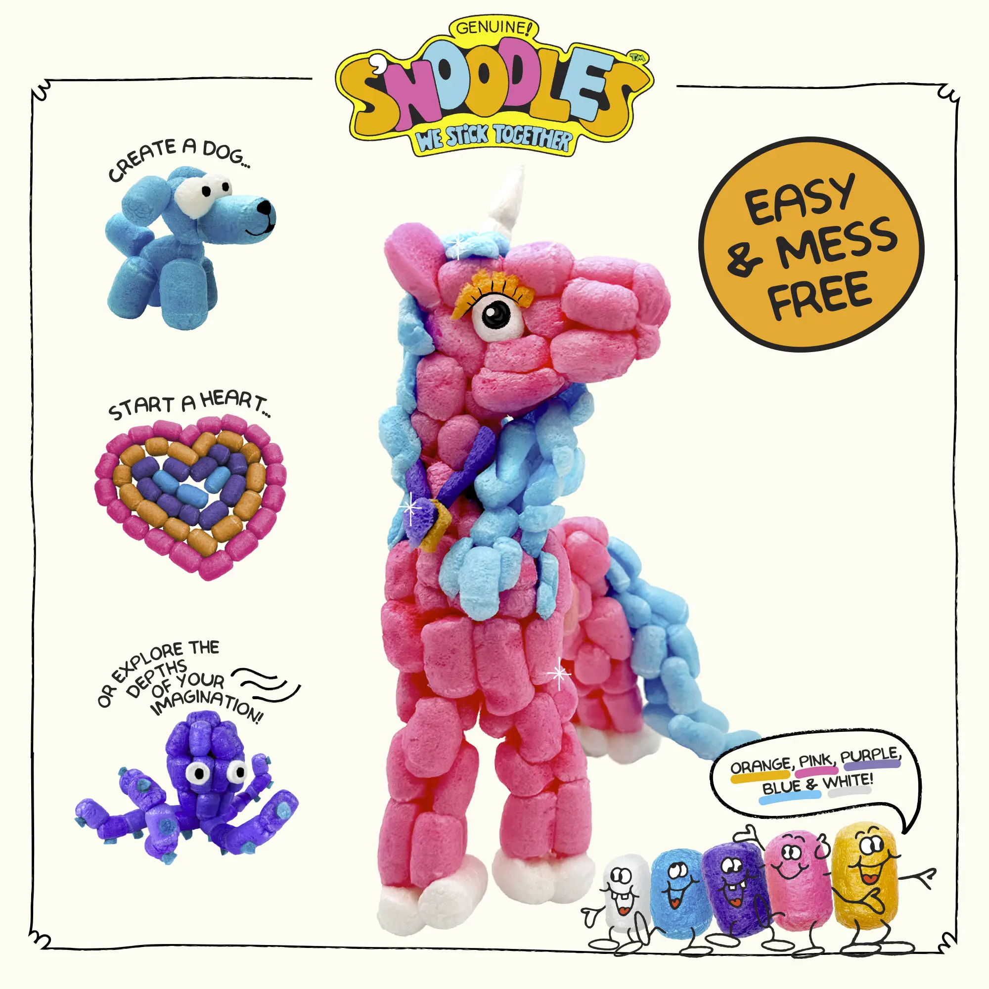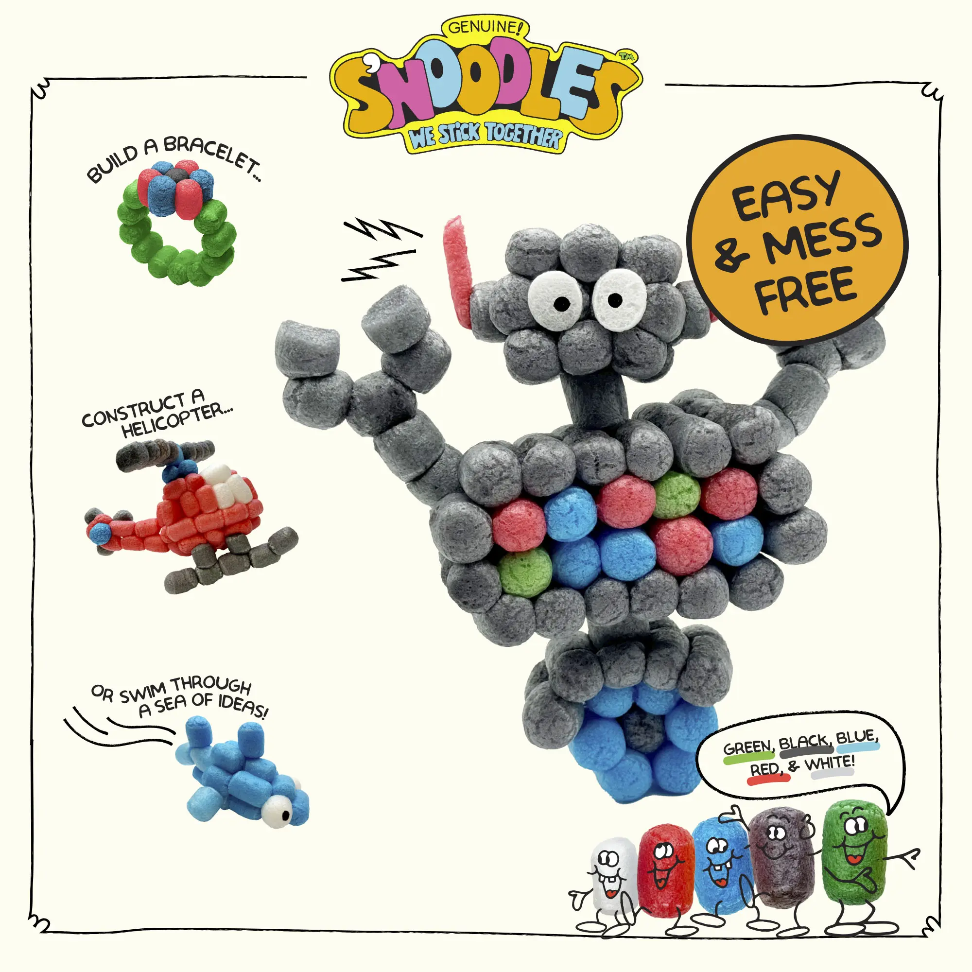 Unleash your child’s creativity with Schylling S’NOODLES, the biodegradable craft kit that turns imagination into fun! Dip, stick, and build guided projects or invent your own designs. Each kit comes with five vibrant colors and everything needed for low-mess, hands-on crafting.