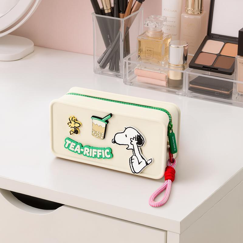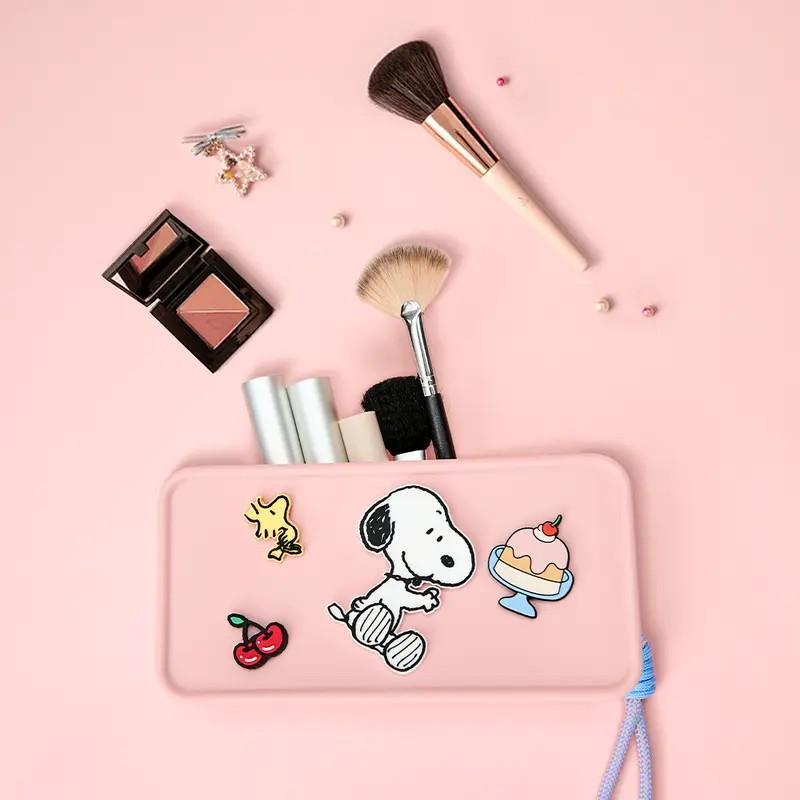 ·This silicone cosmetic bag features a charming Snoopy design. 🐶 It includes a cherry, a cake, and Snoopy, making it visually appealing. The playful touch adds fun to your makeup essentials.