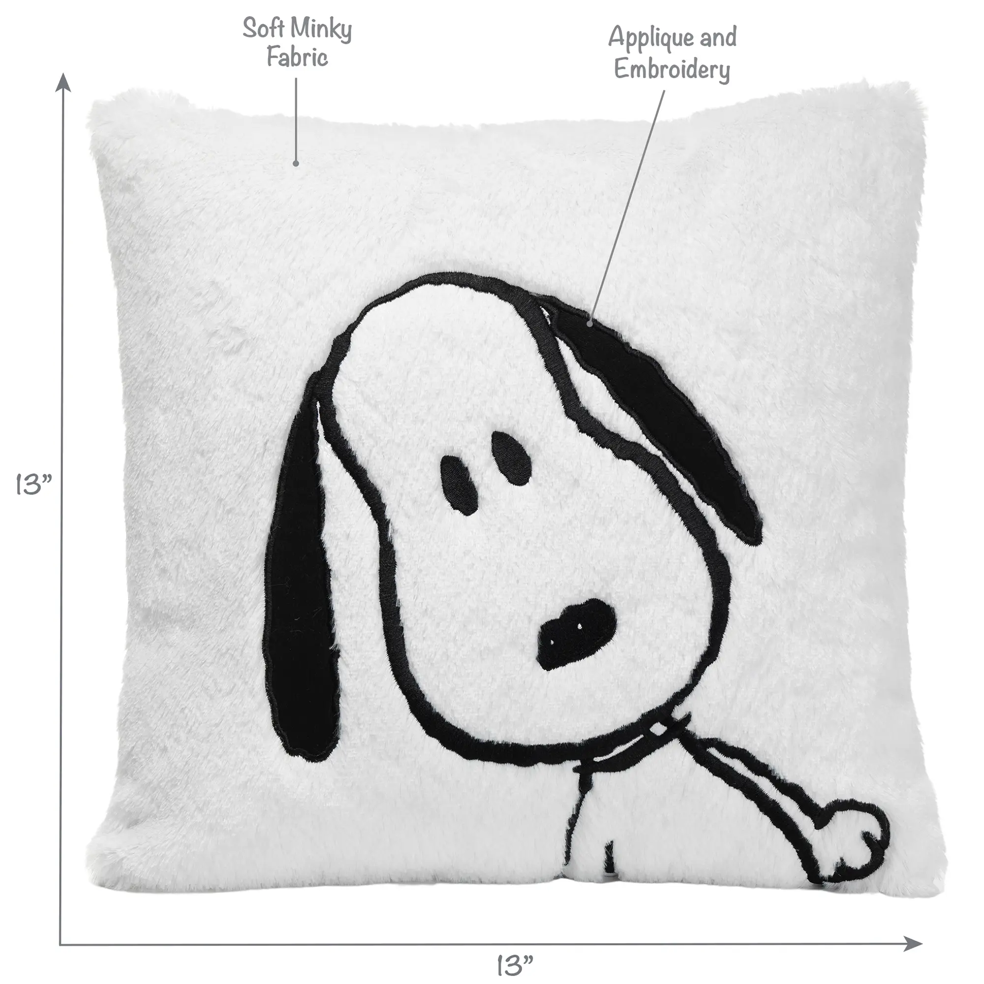 This charming soft and cozy keepsake pillow features our favorite canine/dog, Snoopy. The front fabric is a luxury white minky. An expertly embroidered Snoopy face is featured with his two big floppy ears. The back of the pillow is white cotton twill and has an opening for easy care. This pillow is 13 inches by 13 inches and makes a great baby shower gift or welcome home baby gift.