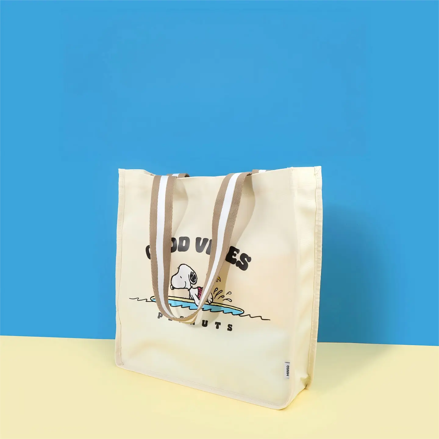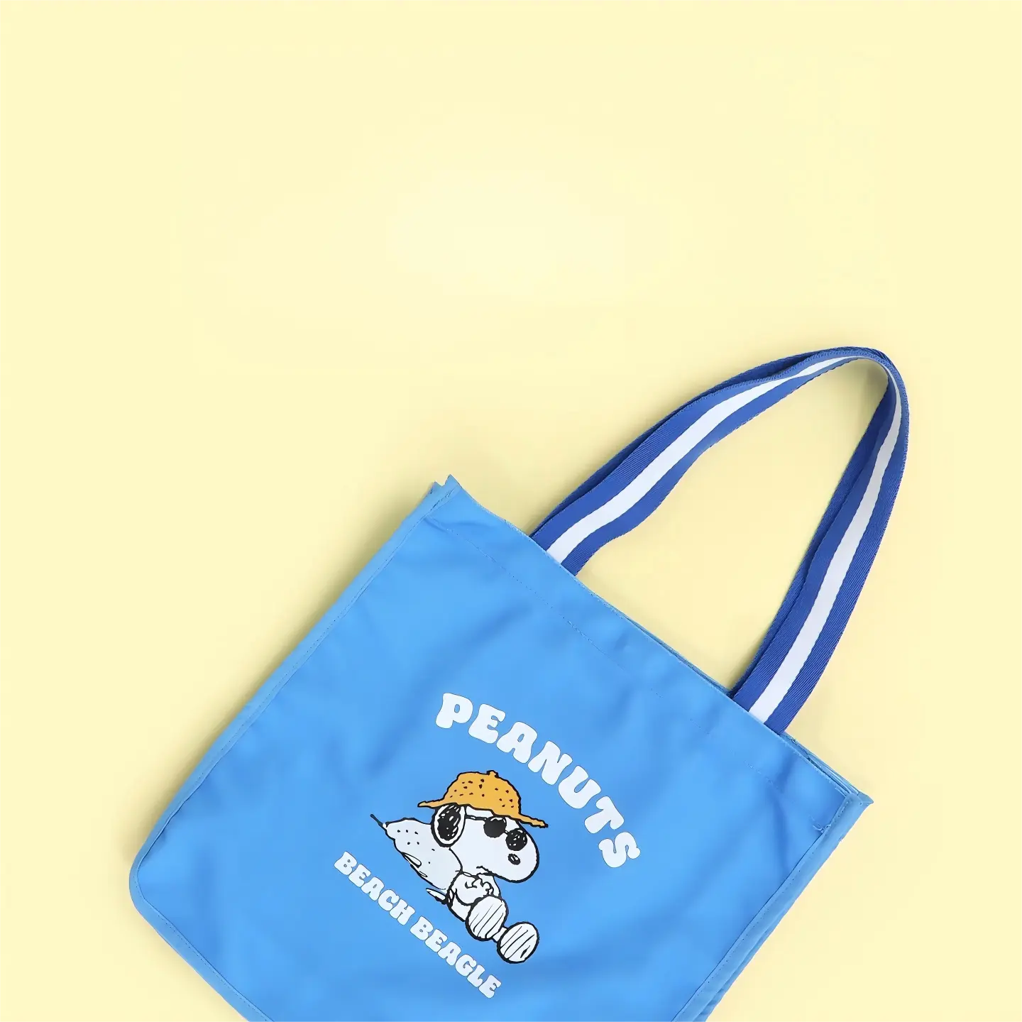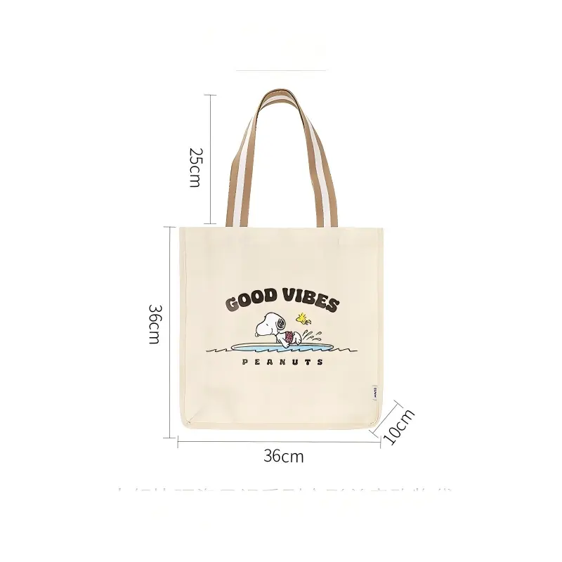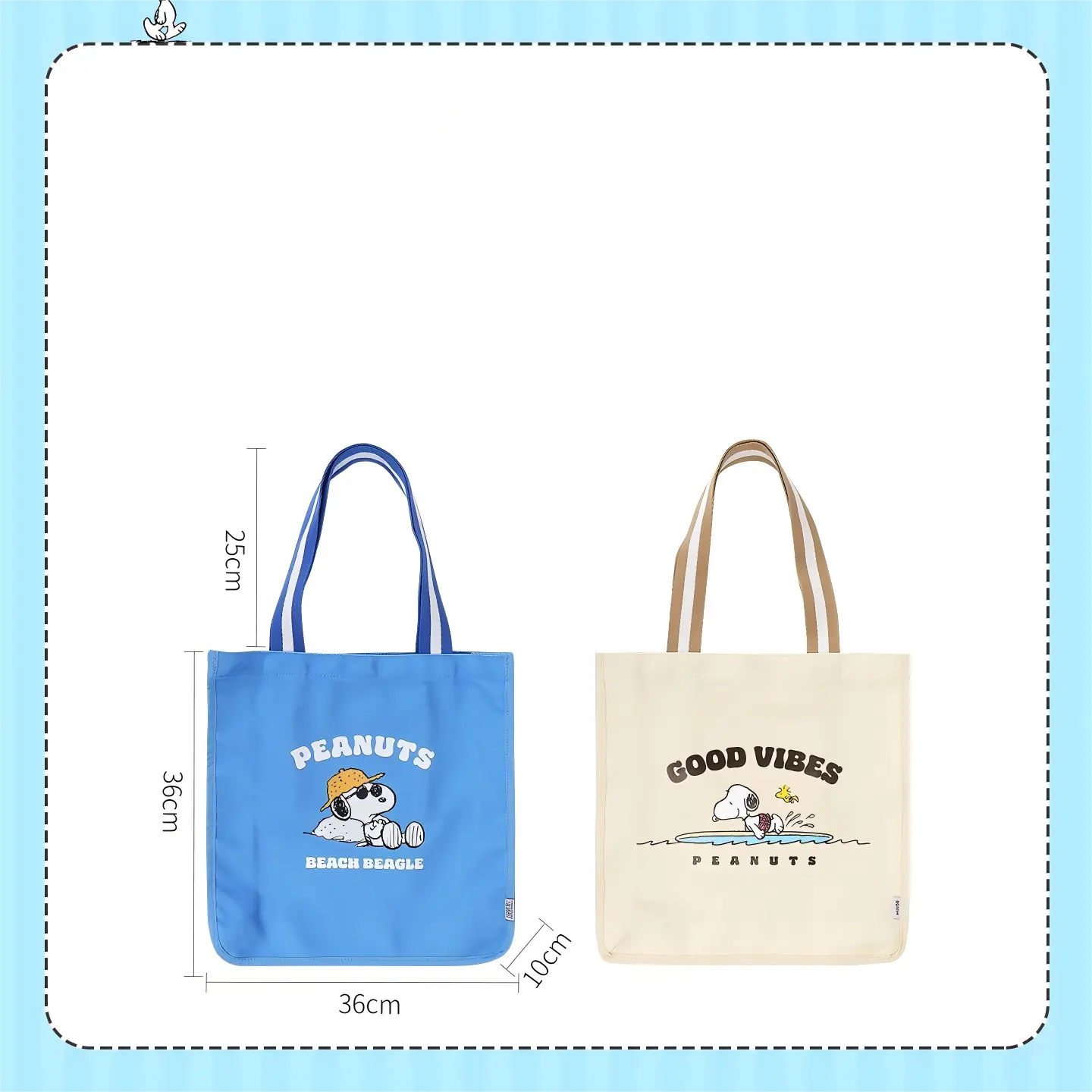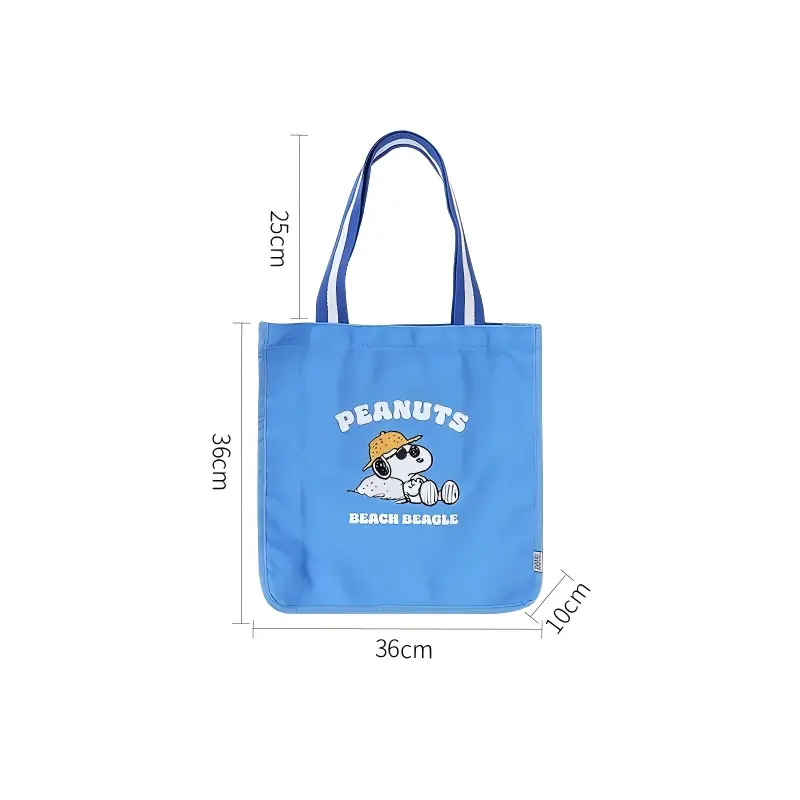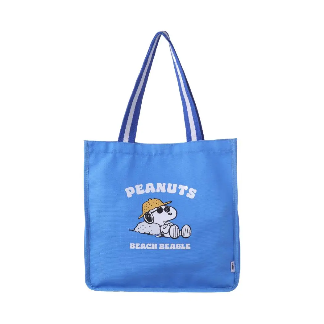 ·2 Styles:Blue Style: Blue bag printed with Snoopy (wearing a sun hat) + "PEANUTS" & "BEACH BUM" lettering, showing a relaxed beach vibe.Apricot Style: Beige bag printed with Snoopy (splashing in water) + "GOOD VIBES" & "PEANUTS" lettering, highlighting a cheerful holiday mood.