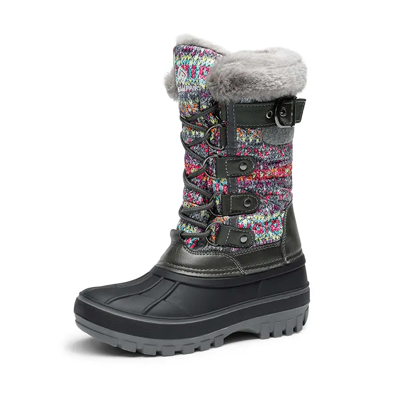 Knee-high kids snow boot with faux-fur trim and adjustable buckle closure