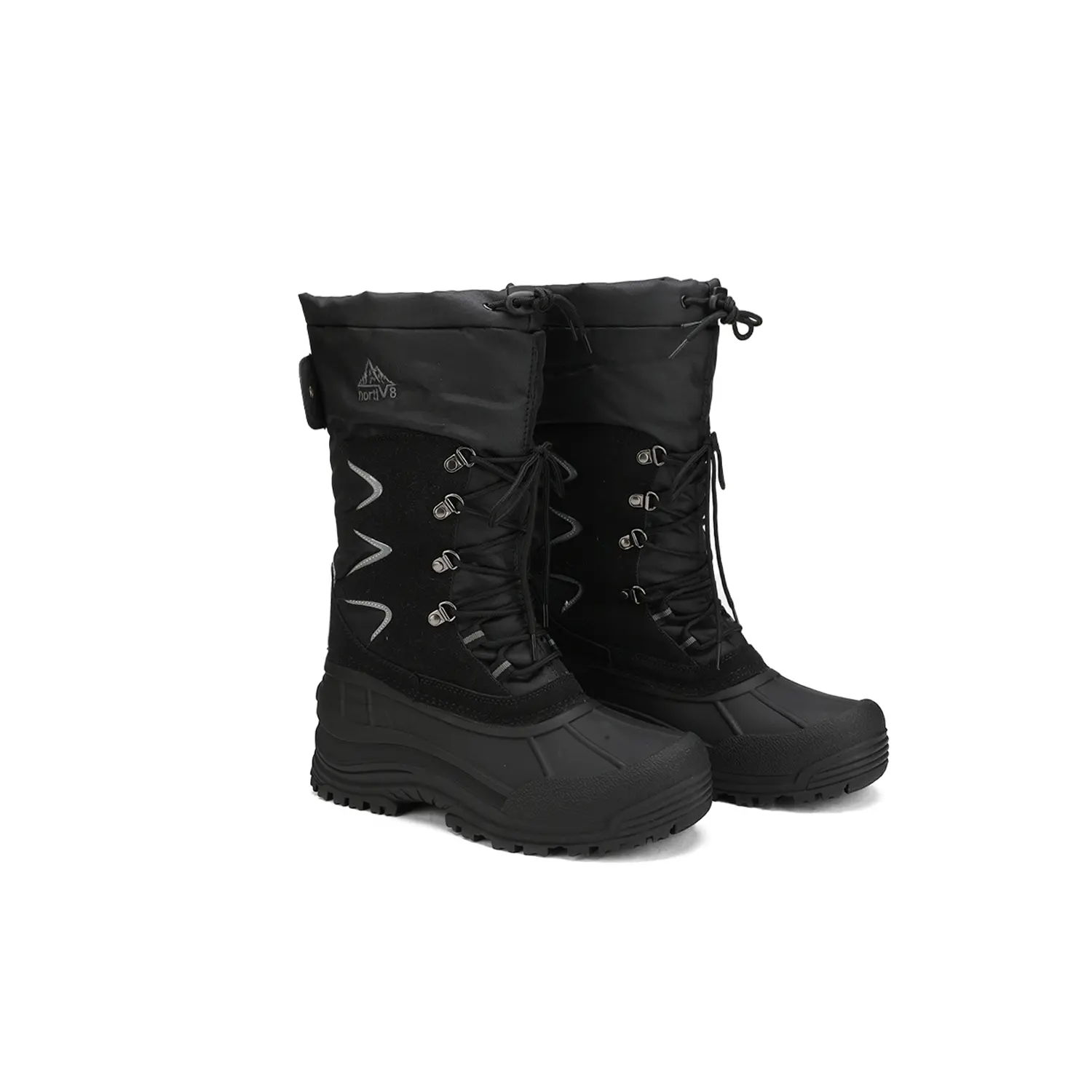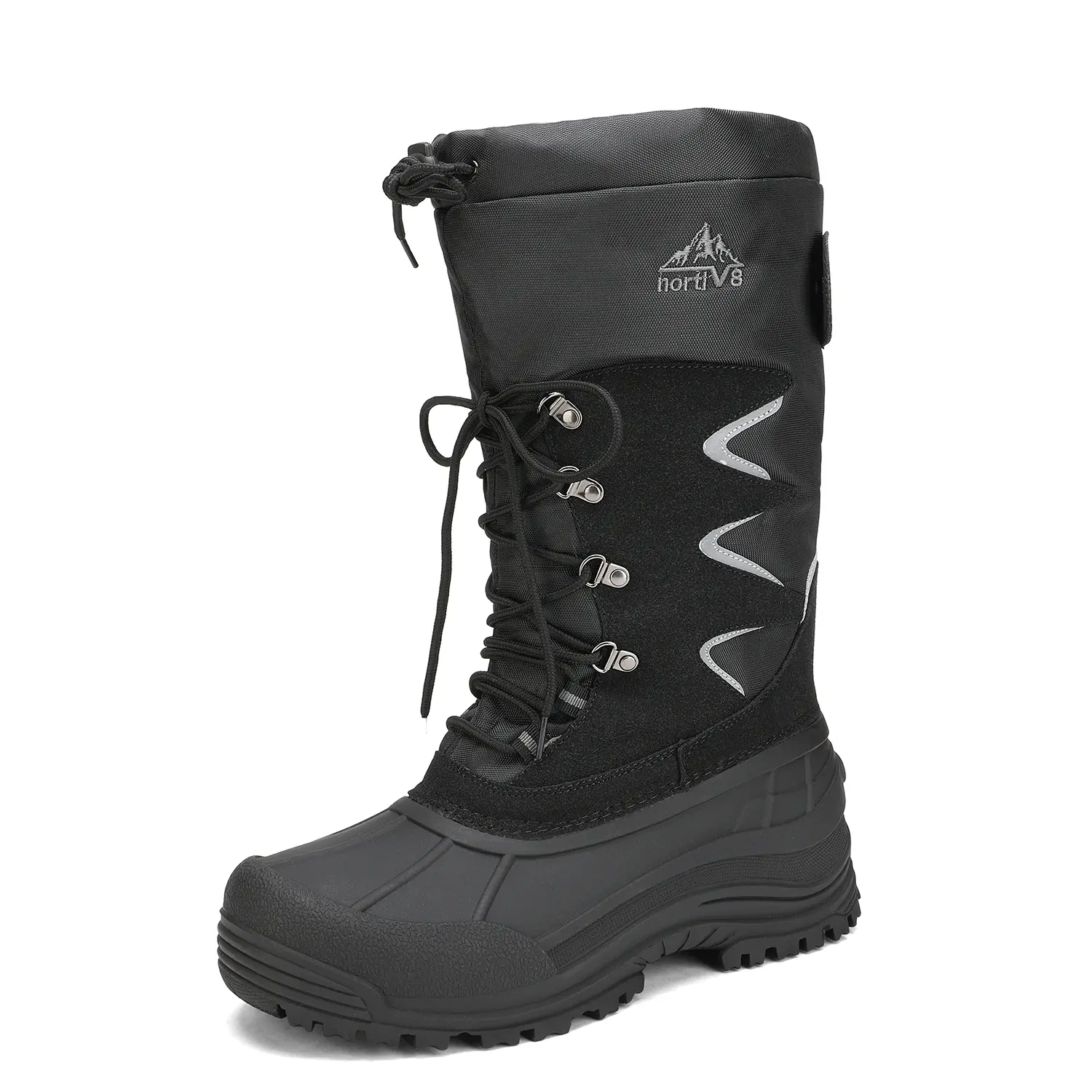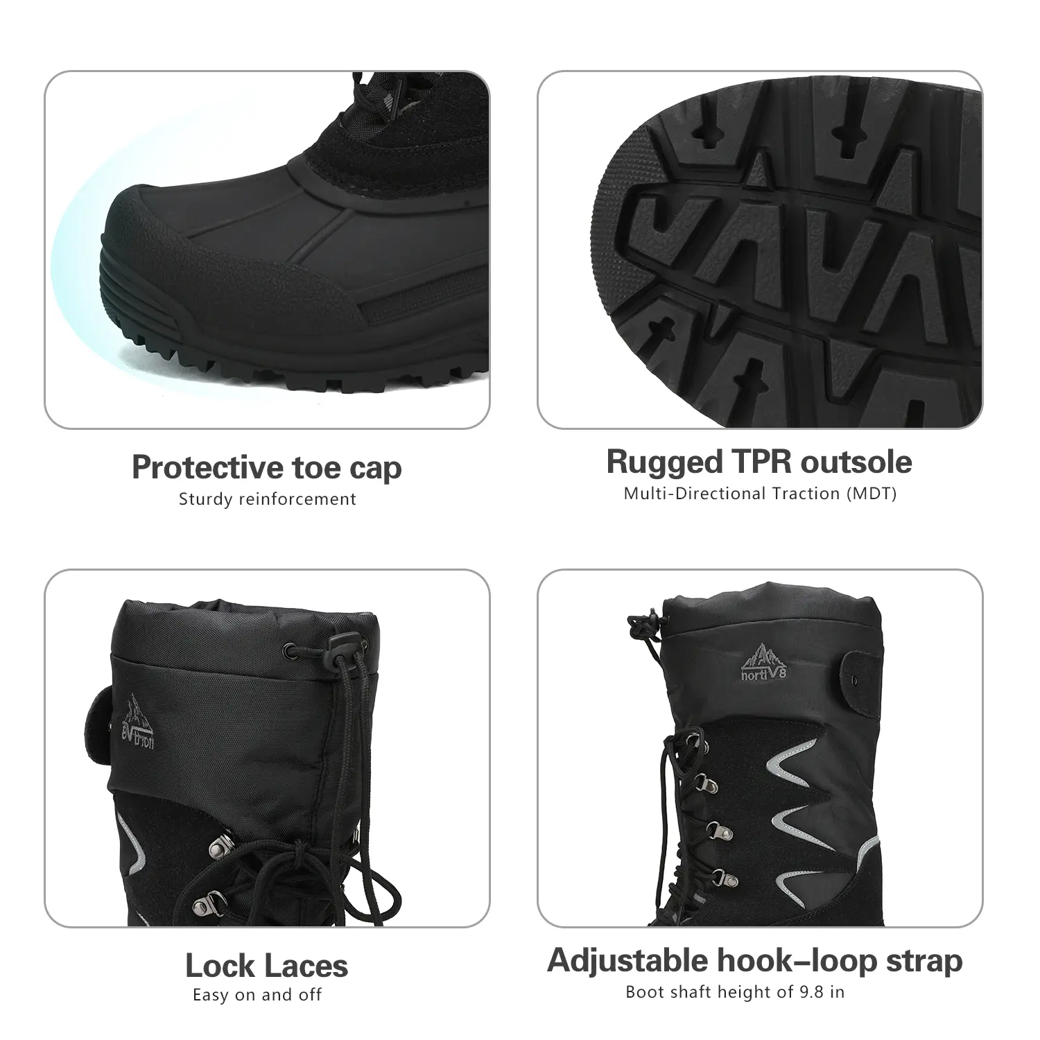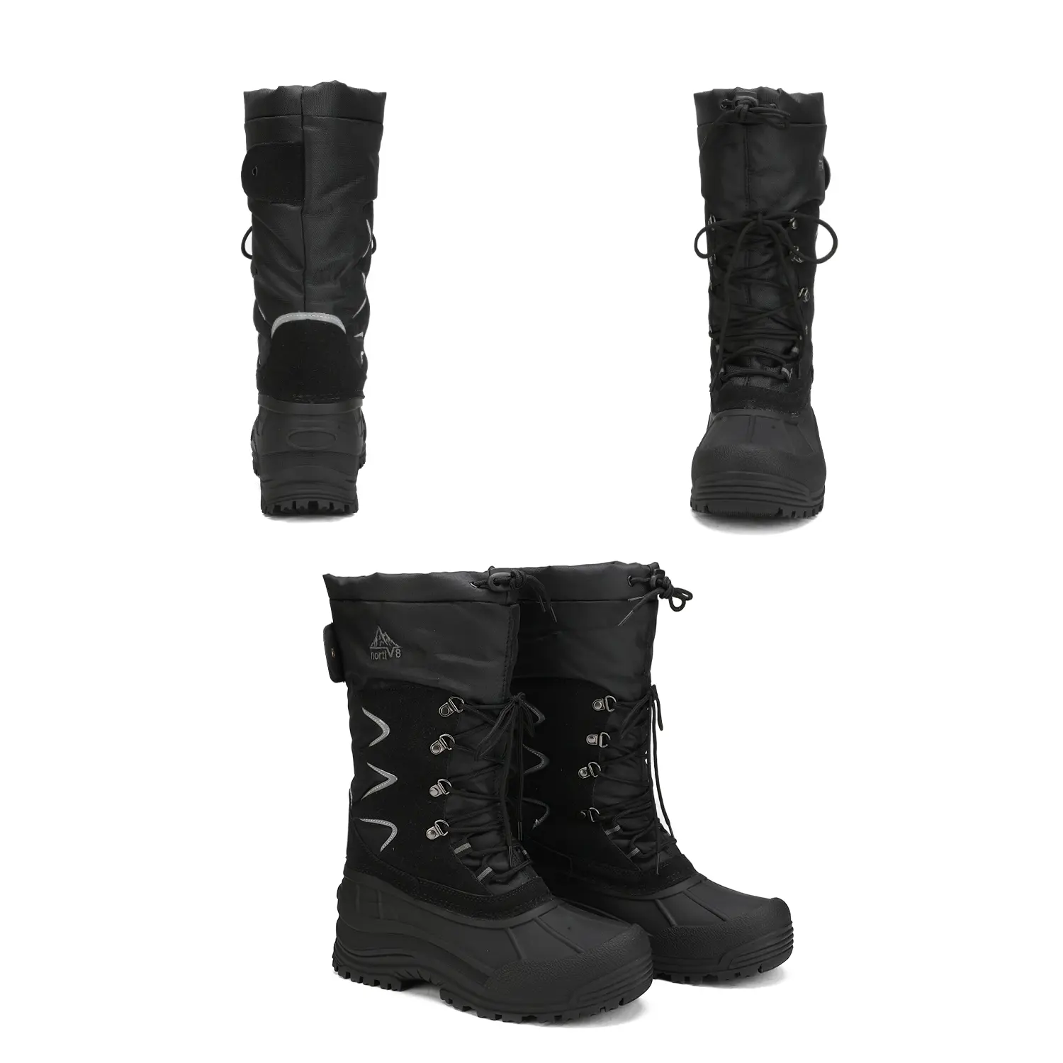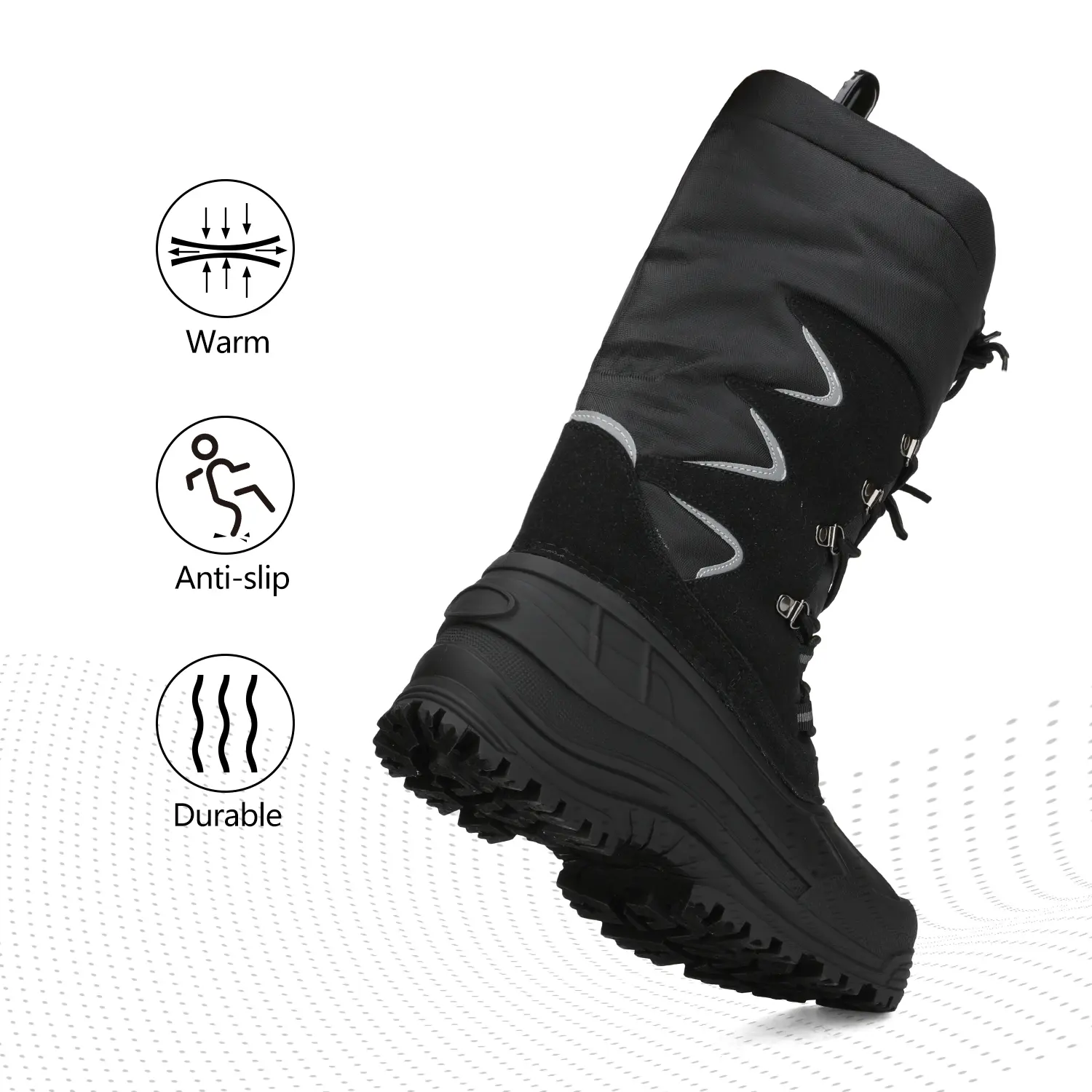 These men's snow boots feature a fur-lined inner for warmth down to -25°F. Thermolite insulation and 200g cotton ensure comfort. The TPR outsole is slip-resistant and seam-sealed, with a protective toe cap. The outer fabric is water and wind-resistant. Perfect for both indoor and outdoor adventures.