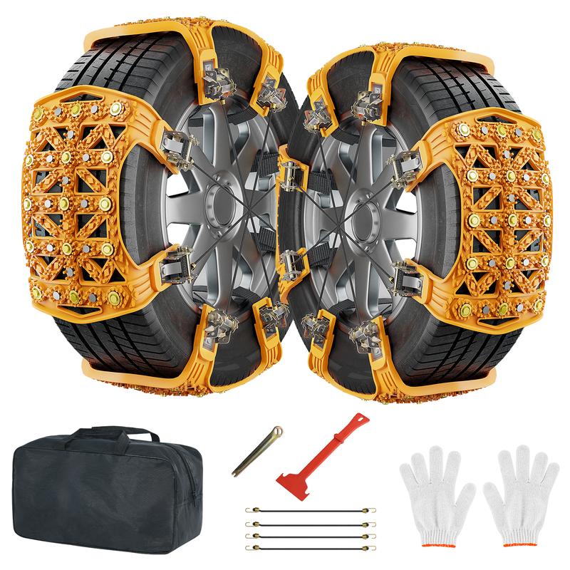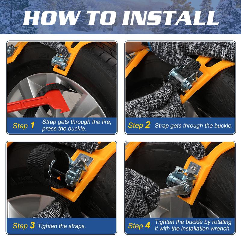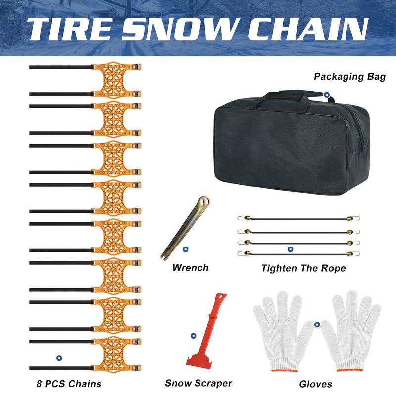 ·High-Traction Control for Safety : Our snow chains for tires can help achieve maximum traction and improve your grip control when slippery roads and snow weather demand it by increasing the friction coefficient between the road surface and tire chains. Plus, our automatic tightening device of snow chains for cars ensures that they will fit snugly and not fall off while driving. Note: please do not exceed 30 MPH when using the security chains