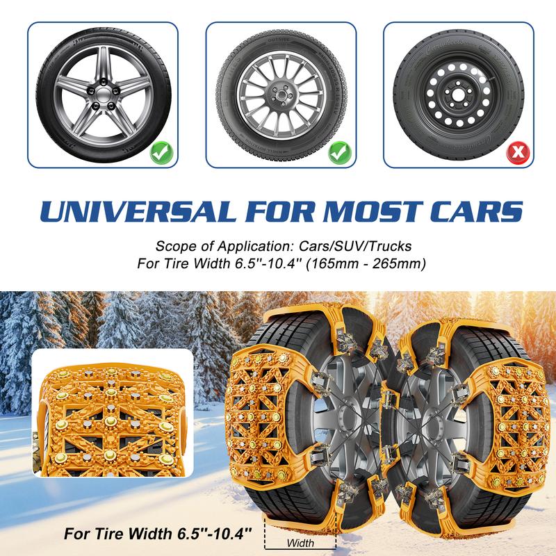 ·Suitable for Most Tires: Our snow chains for cars can be adjusted, and are suitable for tire width 165-275 mm (6.49-10.82 inches). You can check the tire sidewall to identify your tire size and dimensions. Our tire chains can be used in most cars/suvs/pickup trucks. After your purchase, it is recommended to install them in dry and favorable conditions.