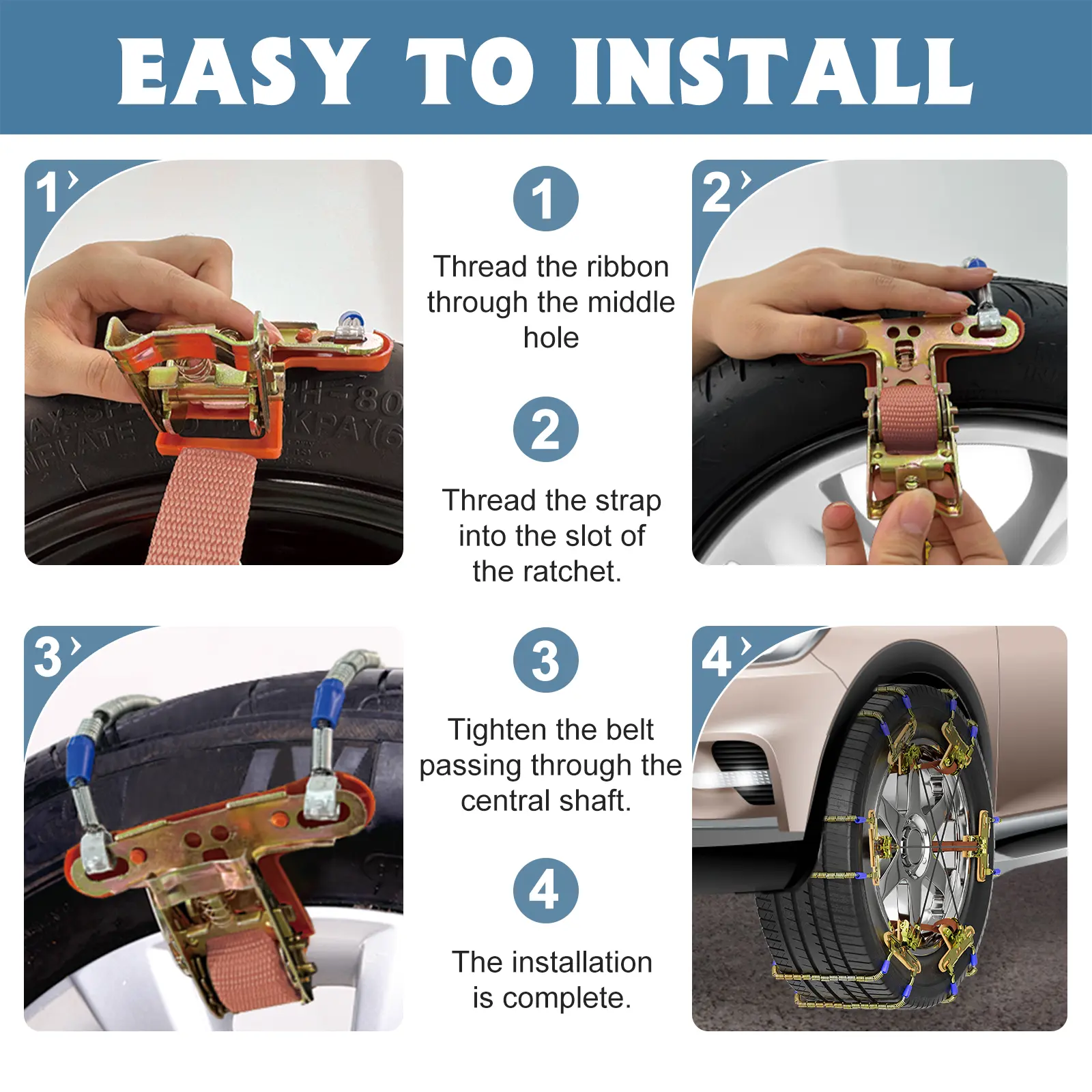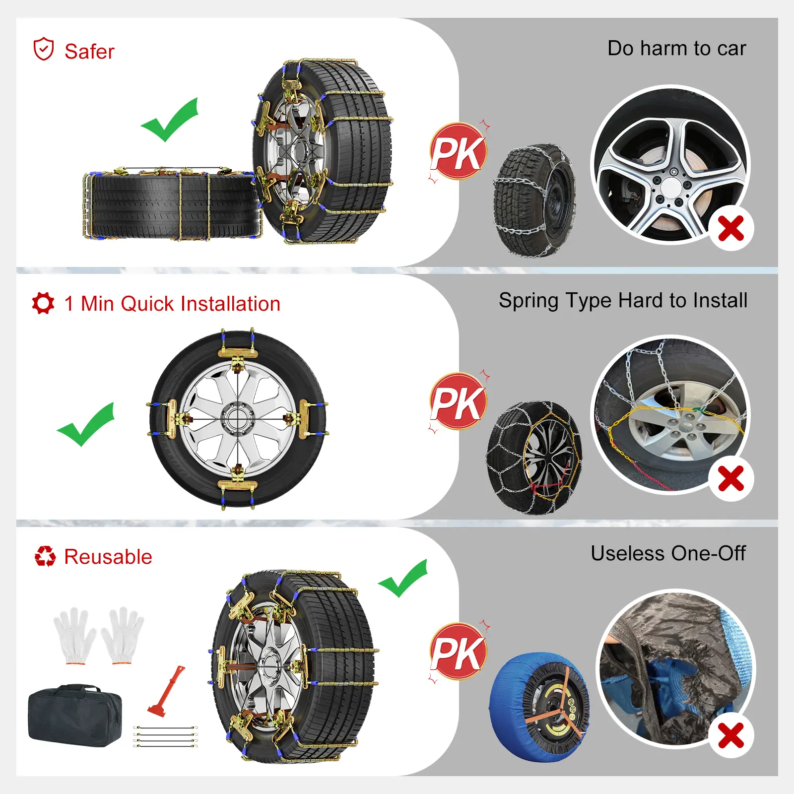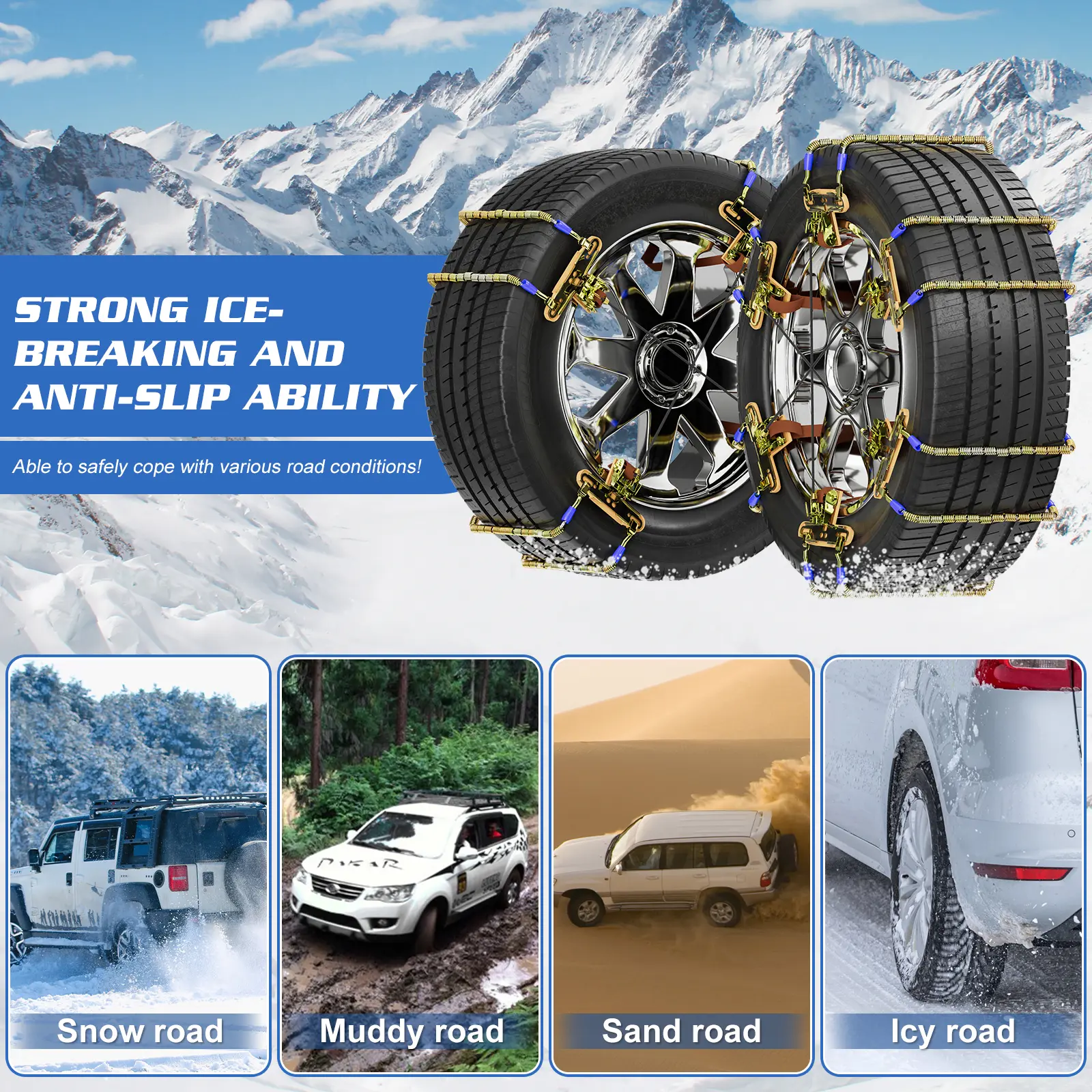 Tired of losing traction on snow, ice, mud, or sand? Our upgraded tire chains feature a bold ice-breaking design that effectively prevents skidding and side slip, giving you control and peace of mind in challenging driving situations.
