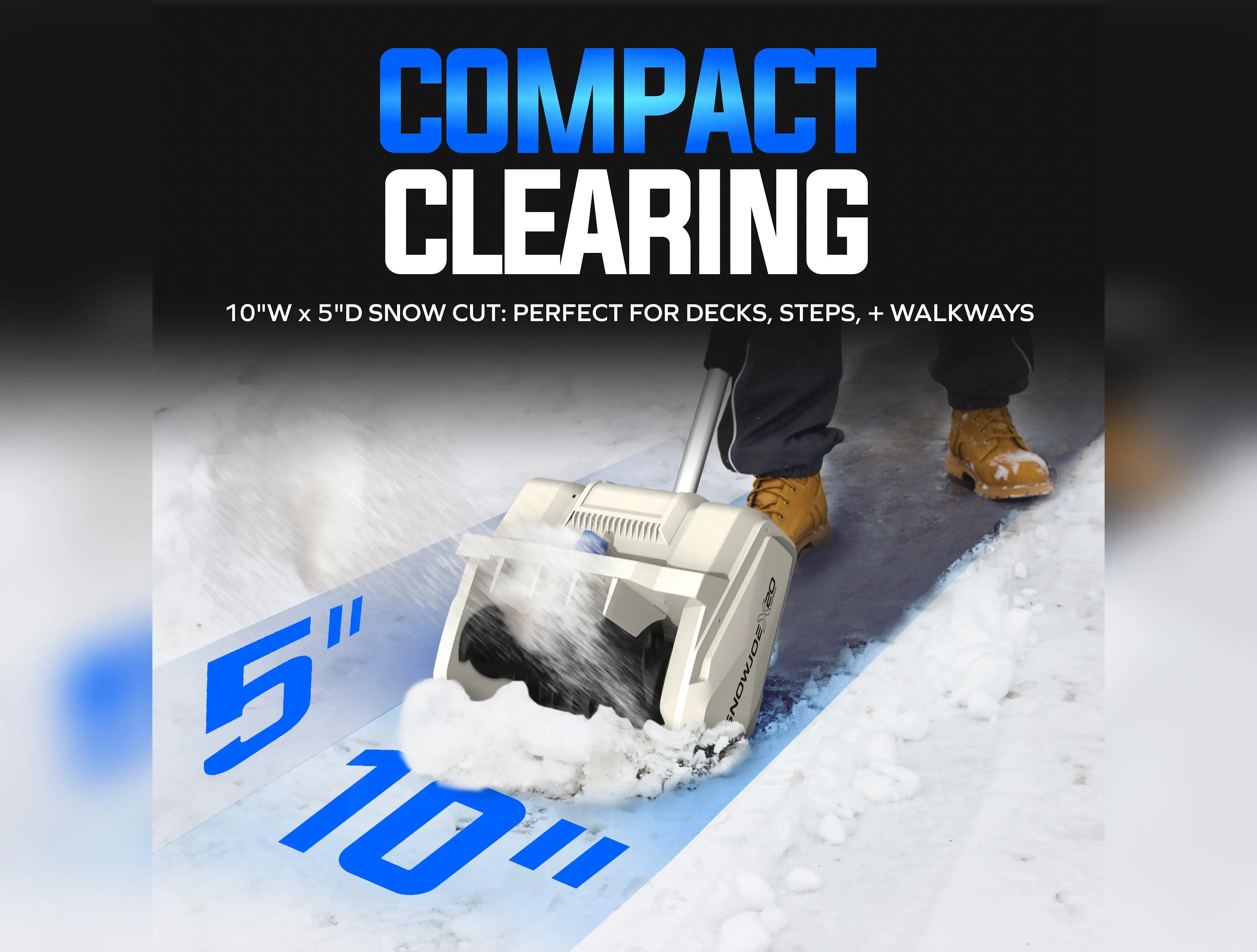 ·COMPACT CLEARING: 10" wide x 5" deep snow cut, perfect for decks, steps, and walkways