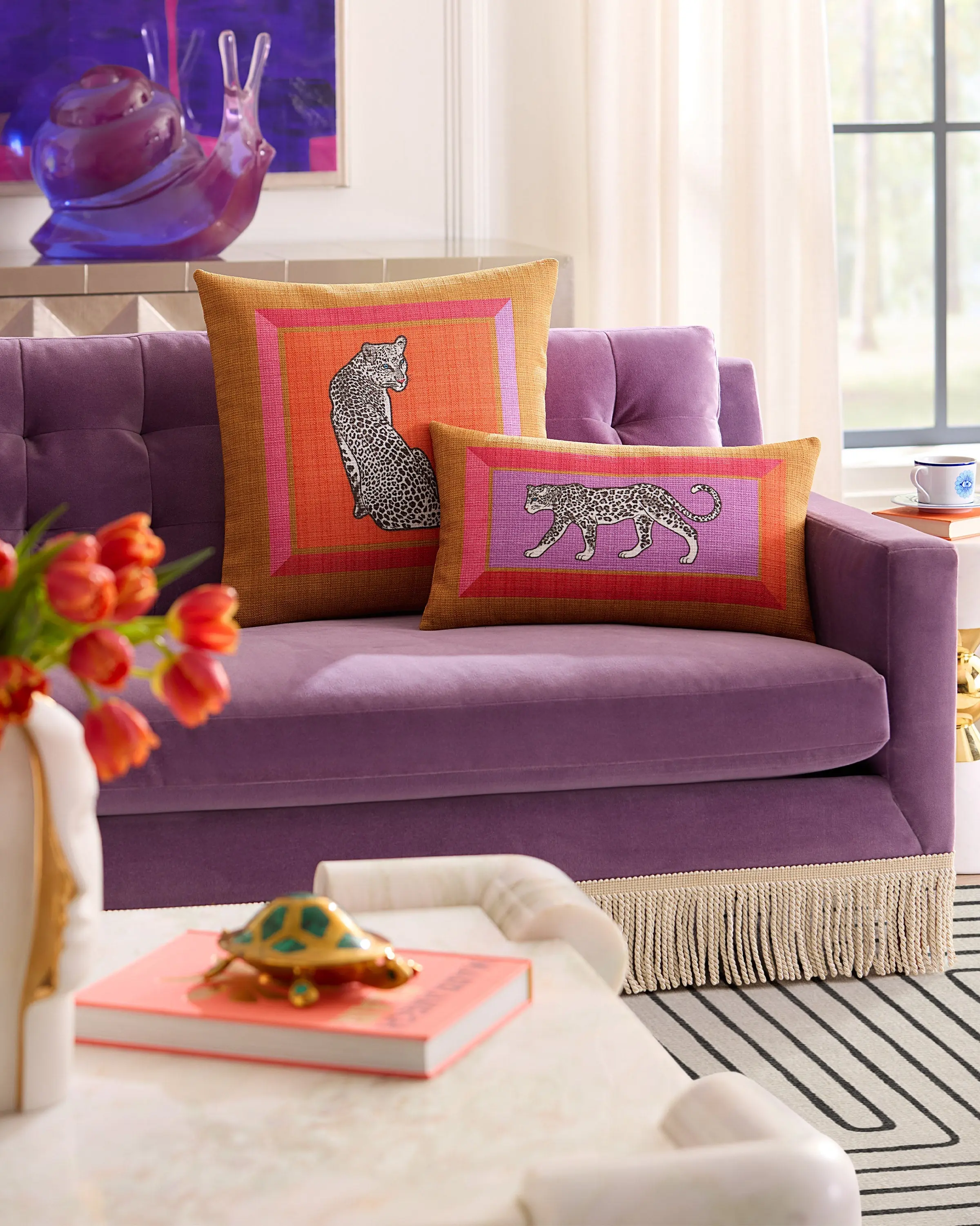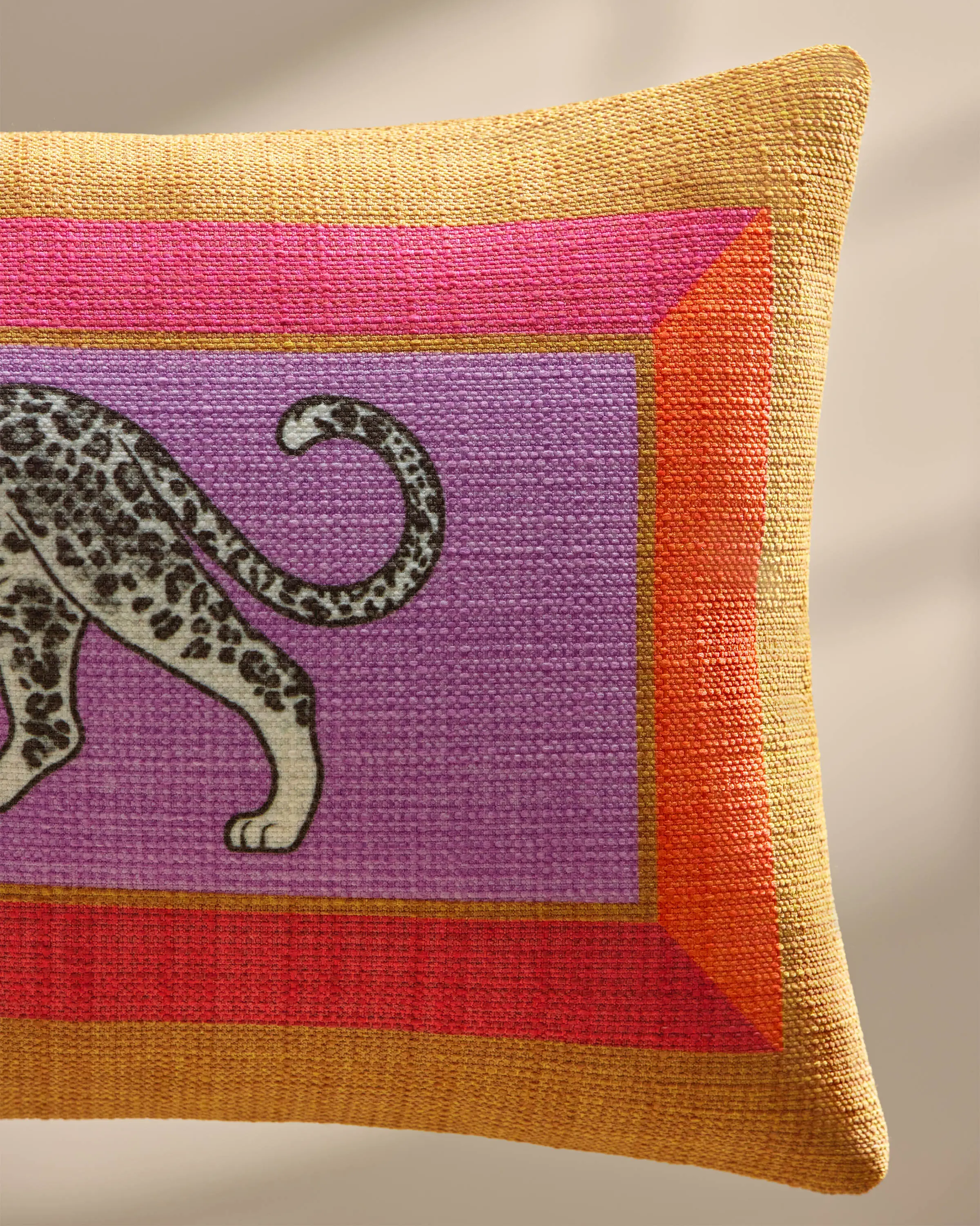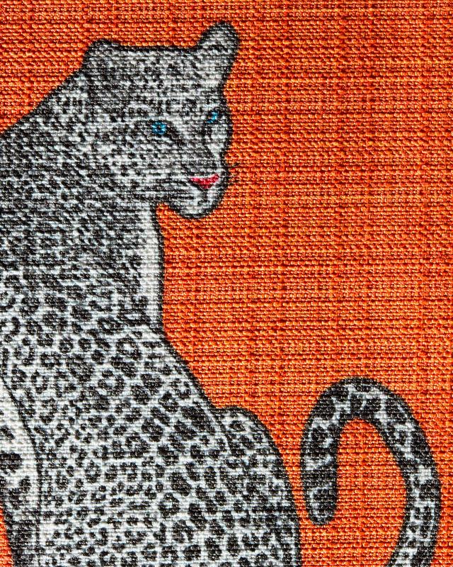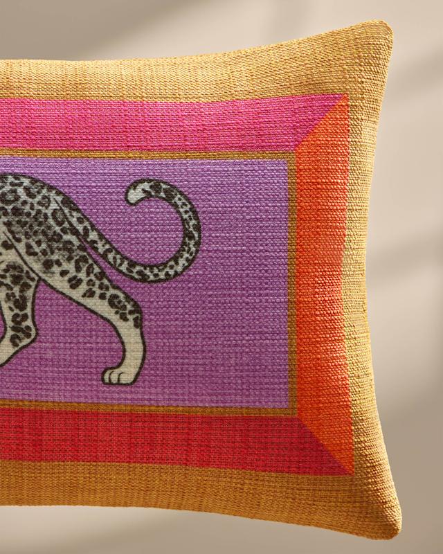 A showstopping snow leopard motif framed in bold geometric lines evokes a feeling of Hollywood regency glamour. Vivid orange, pinks, red, and lavender pop against accents of cognac and gold, creating a vibran design that’s anything but ordinary. Water-resistant, stain-resistant, and machine-washable. Colors may vary slightly according to your device and the lighting in your space.