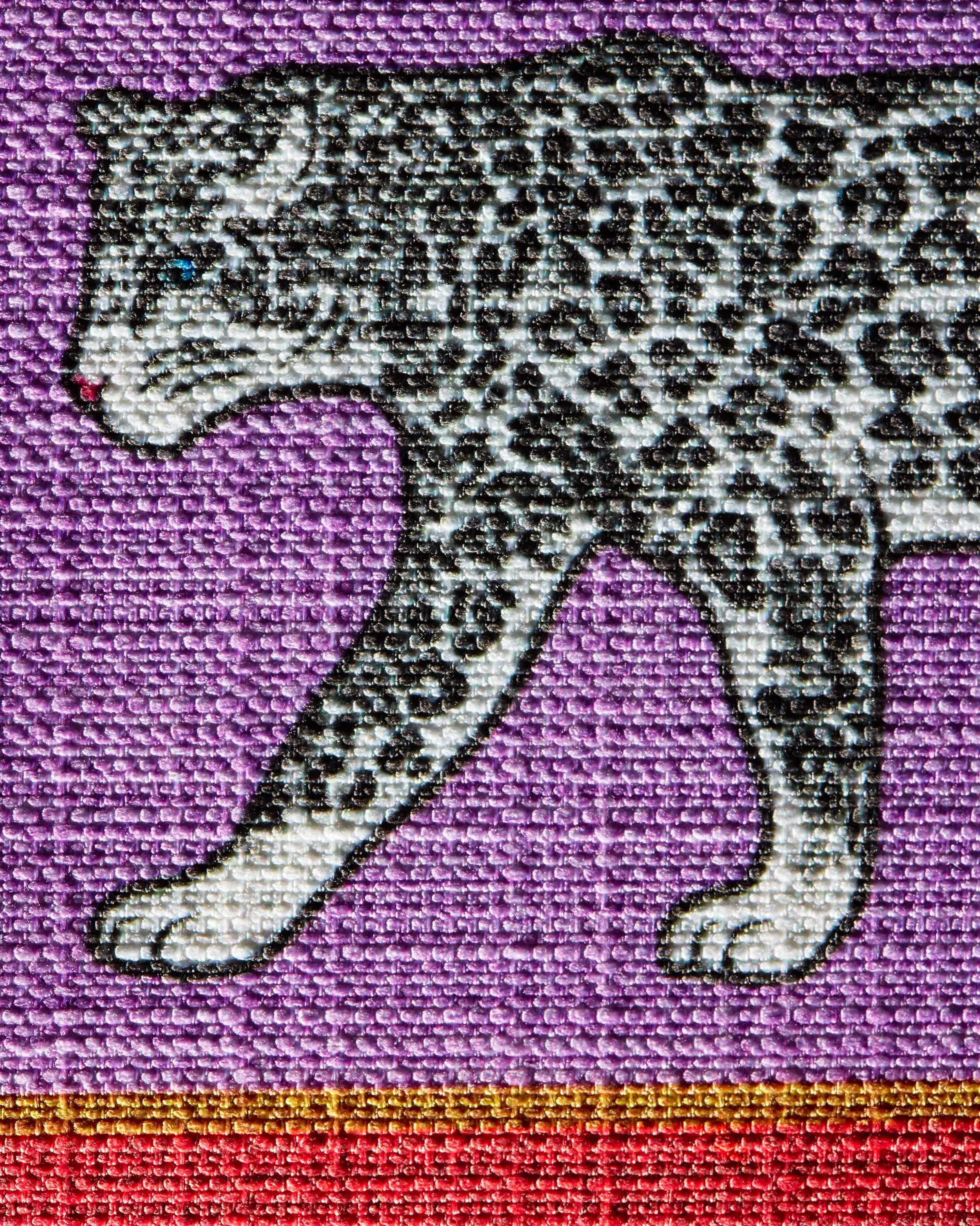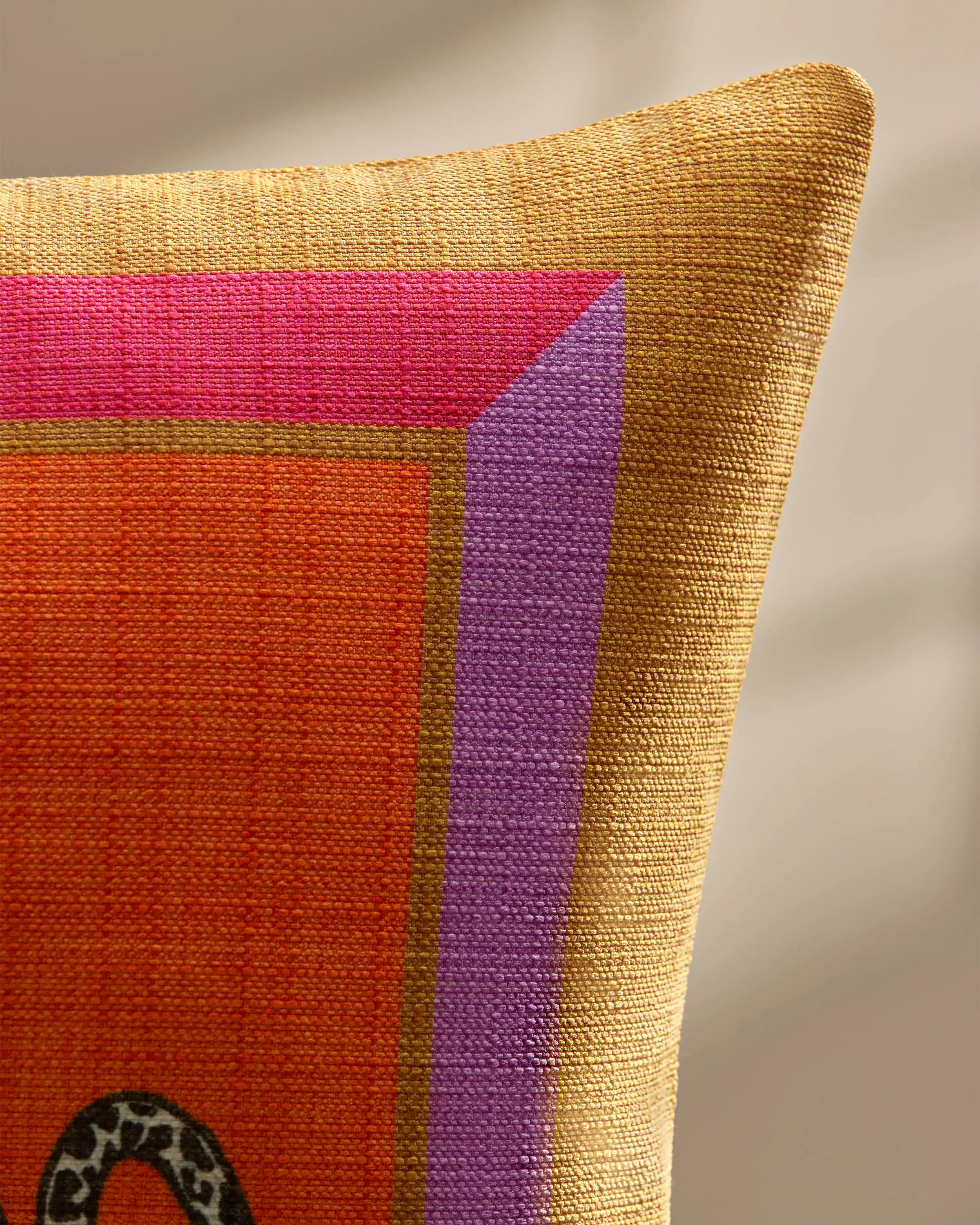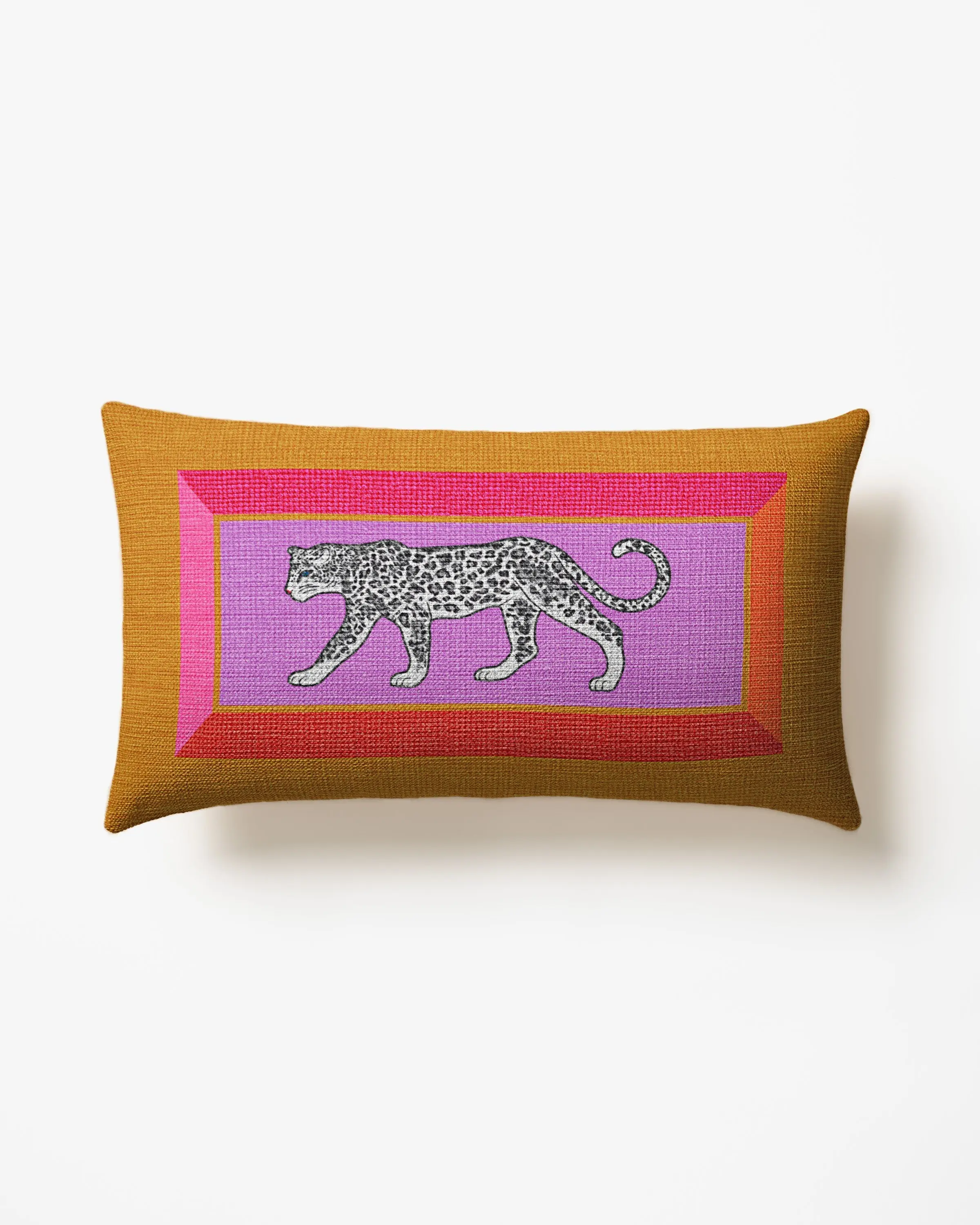 A showstopping snow leopard motif framed in bold geometric lines evokes a feeling of Hollywood regency glamour. Vivid orange, pinks, red, and lavender pop against accents of cognac and gold, creating a vibran design that’s anything but ordinary. Water-resistant, stain-resistant, and machine-washable. Colors may vary slightly according to your device and the lighting in your space.