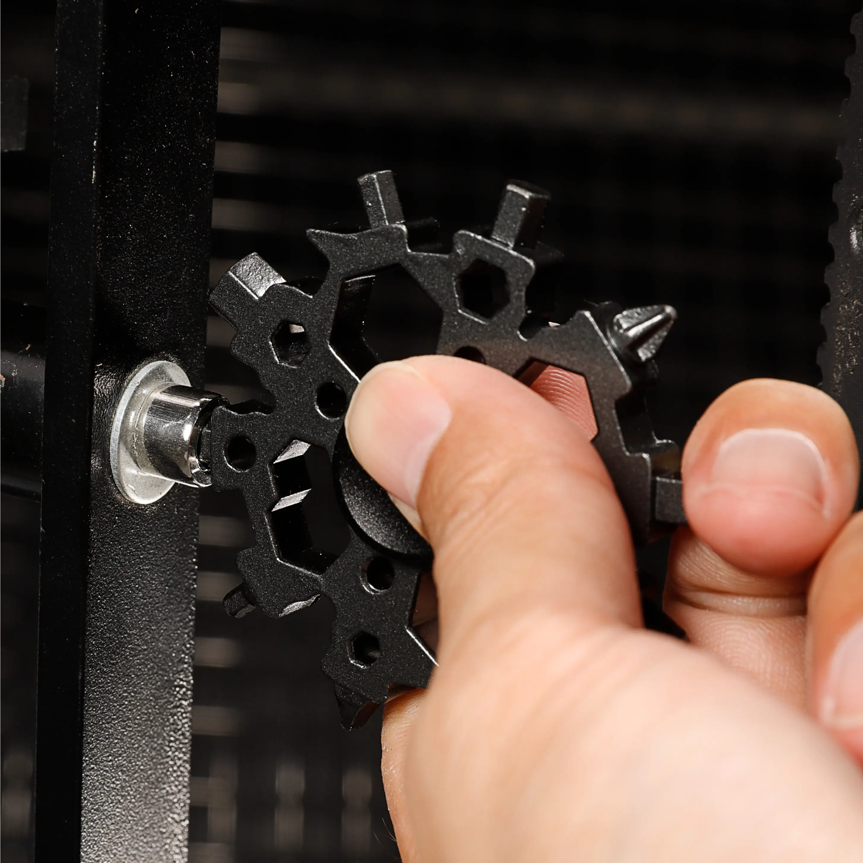 【23-in-1 Snowflake Multi-Tool】Includes slotted screwdriver, Phillips screwdriver, T20 Torx screwdriver, box cutter / rope cutter, bottle opener, and key hole. Features Allen wrenches in Metric (3, 4, 5, 6, 8, 10 mm) and outer hex wrenches in Metric (5, 7, 8, 9, 10, 11, 12 mm), plus additional inner hex sizes (5×5 mm) and flat wrench size 3.5 mm, designed for everyday repair and adjustment tasks.