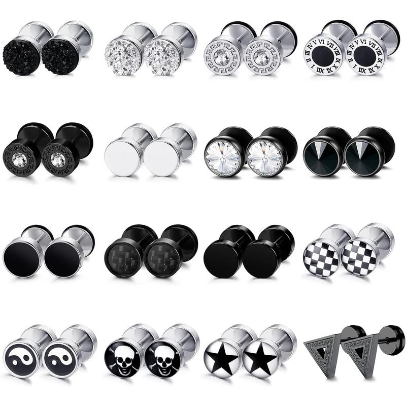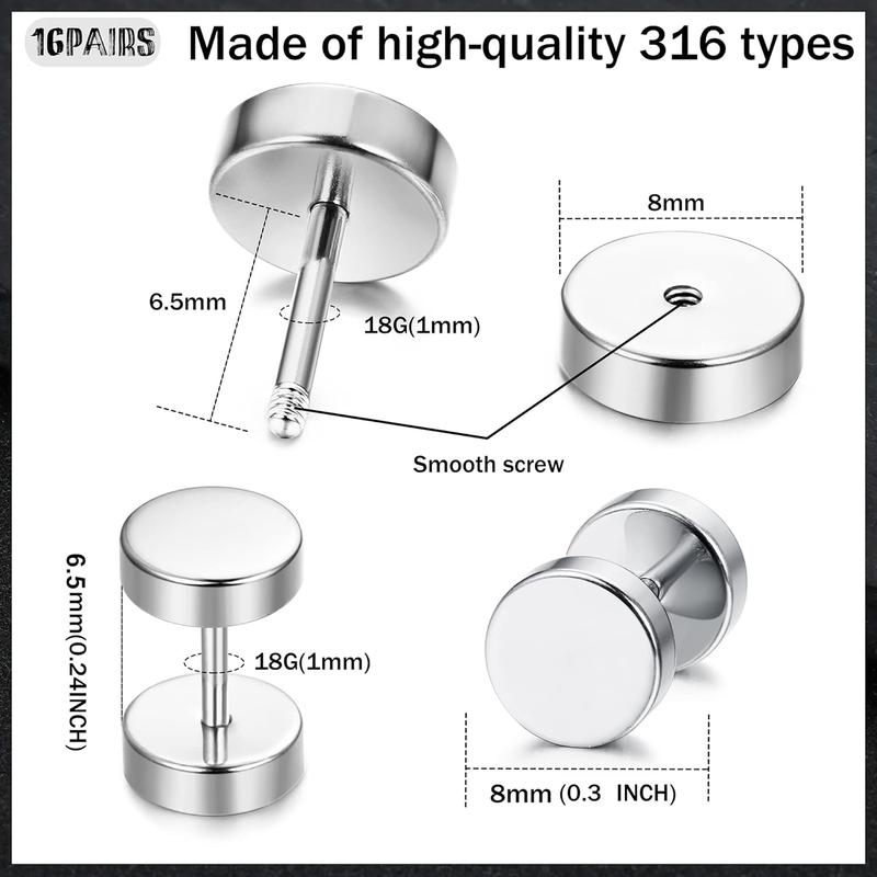 Get 16 pairs of fake gauge earrings in various styles, including black and silver. These multiple styles offer a change of pace from day to day. Perfect for any occasion, they ensure you stay stylish and classic. Ideal for men and women, these earrings are versatile and timeless.