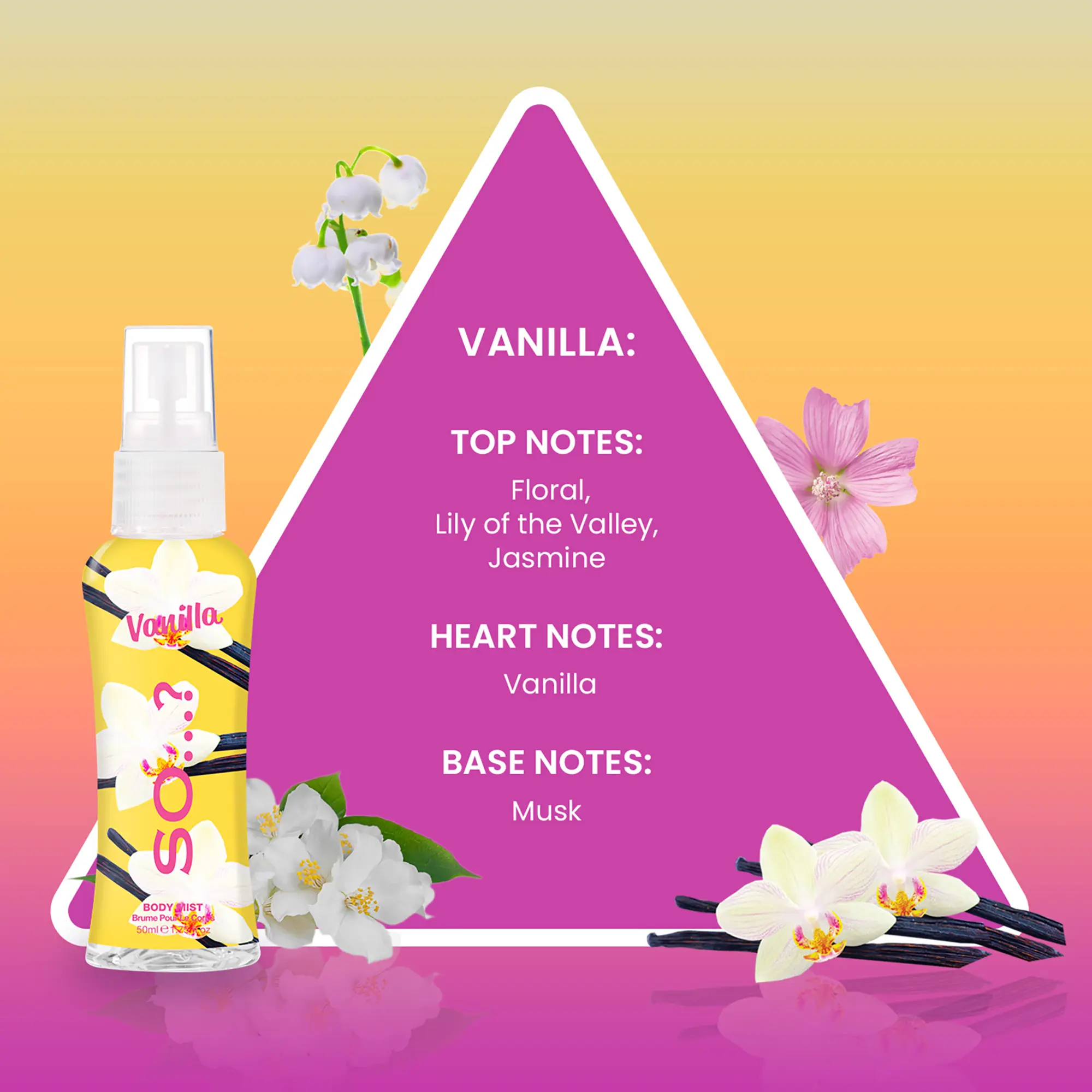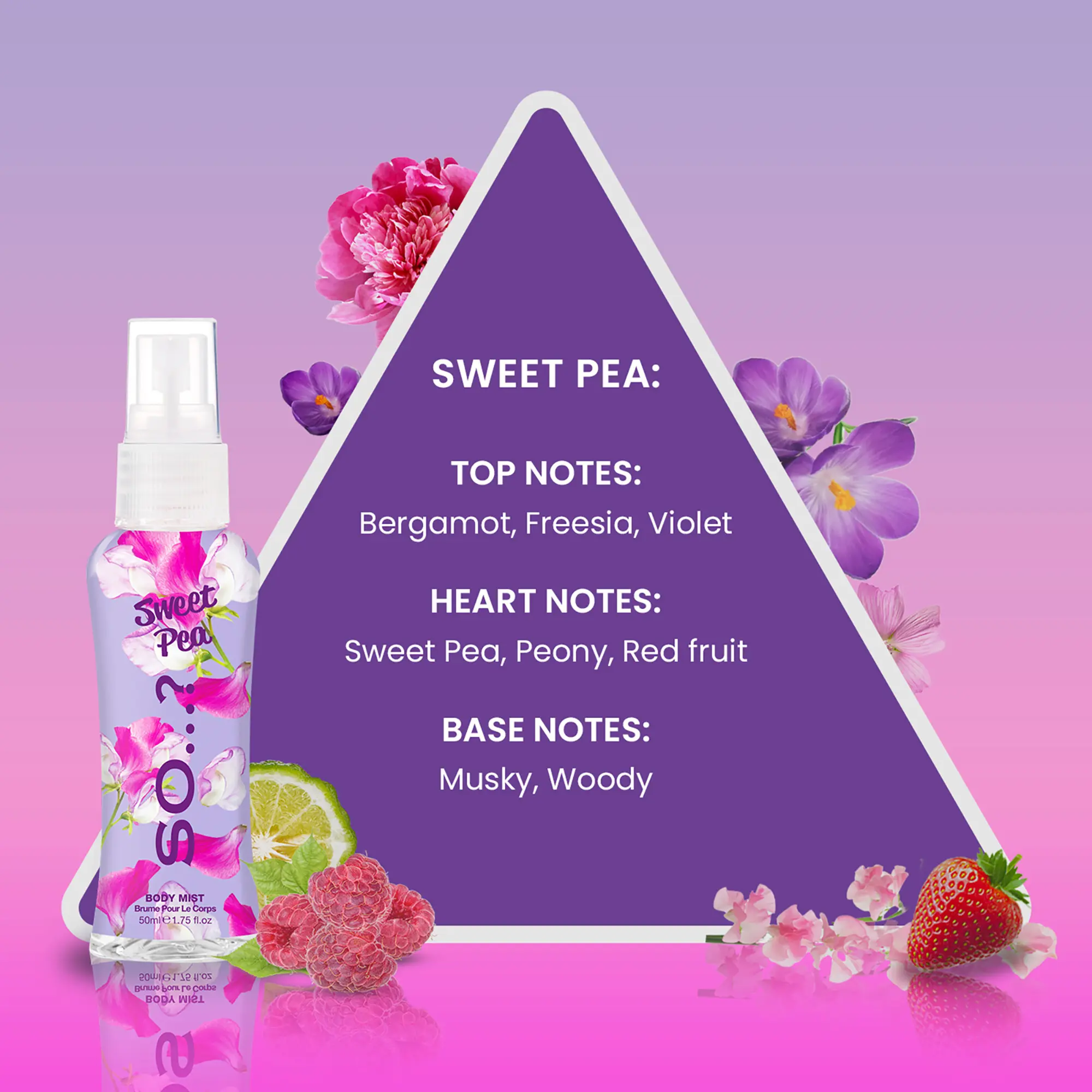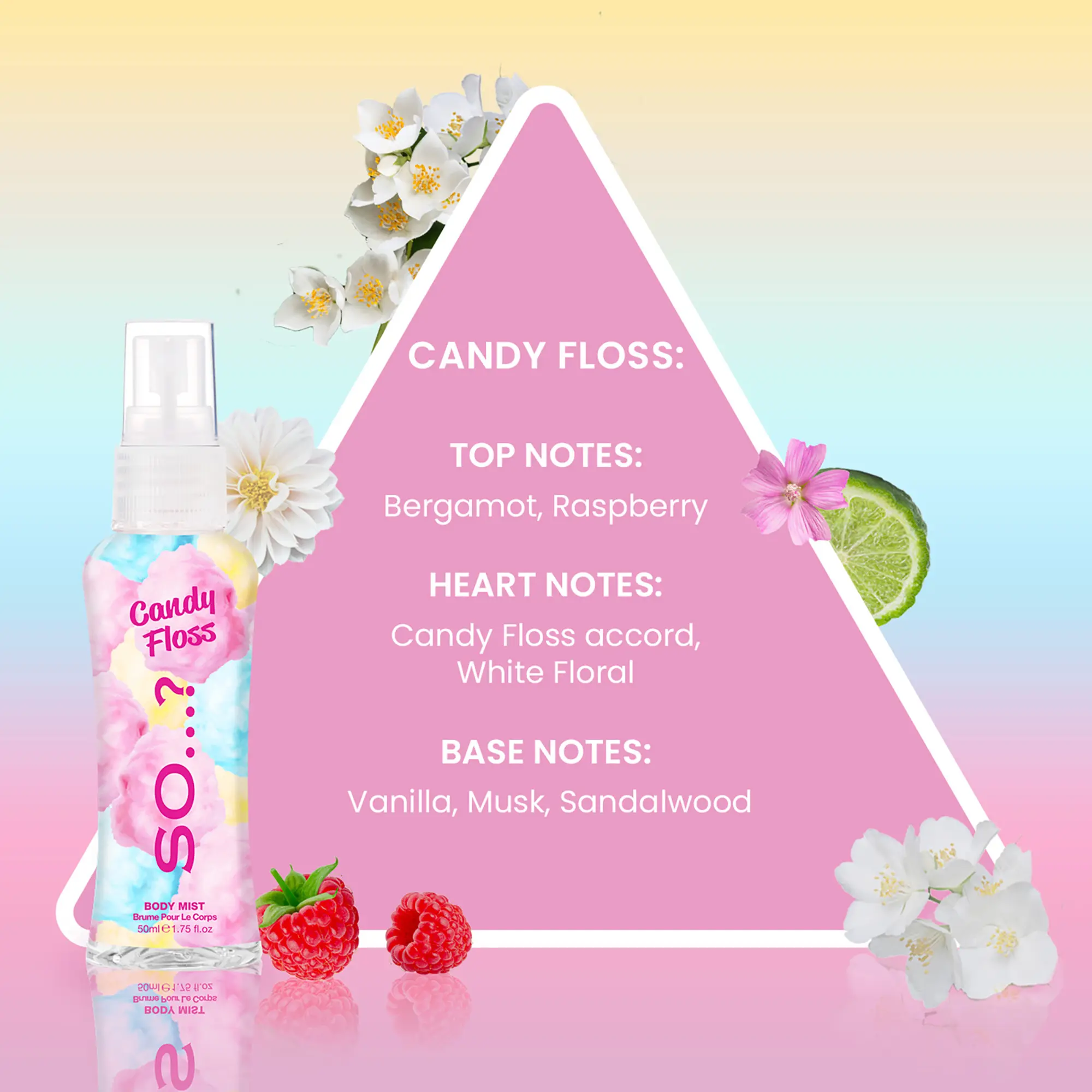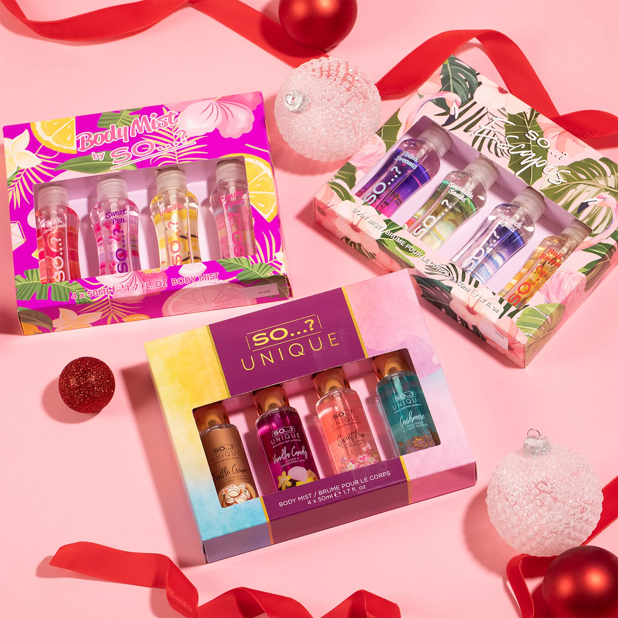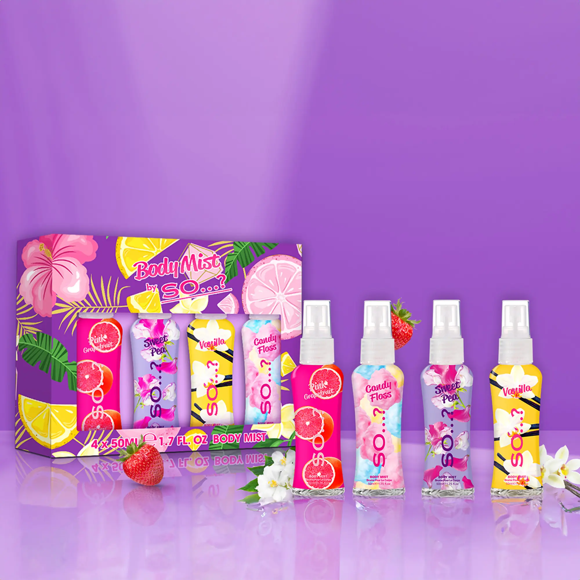 Introducing the Body Mist Set by So…?, a fragrance for women that offers a delightful and refreshing everyday scent experience. This perfume set for women features four unique perfume bottles, each designed to empower the wearer with a scent that matches every style, mood, and occasion. The set includes 1.7 oz or 50 ml bottles of Pink Grapefruit, Sweet Pea, Vanilla, and Candy Floss - sweet and fruity to fresh and floral body mist scents perfect for an everyday refresh throughout the day. The So…? Body Mist Set makes an ideal gift for her, especially for women who appreciate a pleasing fragrance. Each bottle carries a distinctive perfume for women that is attractive and empowering. The Pink Grapefruit has a zesty and refreshing scent, while the Sweet Pea offers a softer, more feminine fragrance. For lovers of gourmand scents, the Vanilla body spray is a perfect choice, offering vanilla's comforting and familiar aroma. Lastly, the Candy Floss scent is a playful and sweet treat for the senses. Practical and versatile, this perfume set for women can be used as a travel-size perfume, making it a convenient on-the-go fragrance refresh. Each bottle contains between 650 and 1000 sprays, ensuring a long-lasting perfume for women that is designed to last up to 6 hours; the ideal cologne for women who are always on the move.