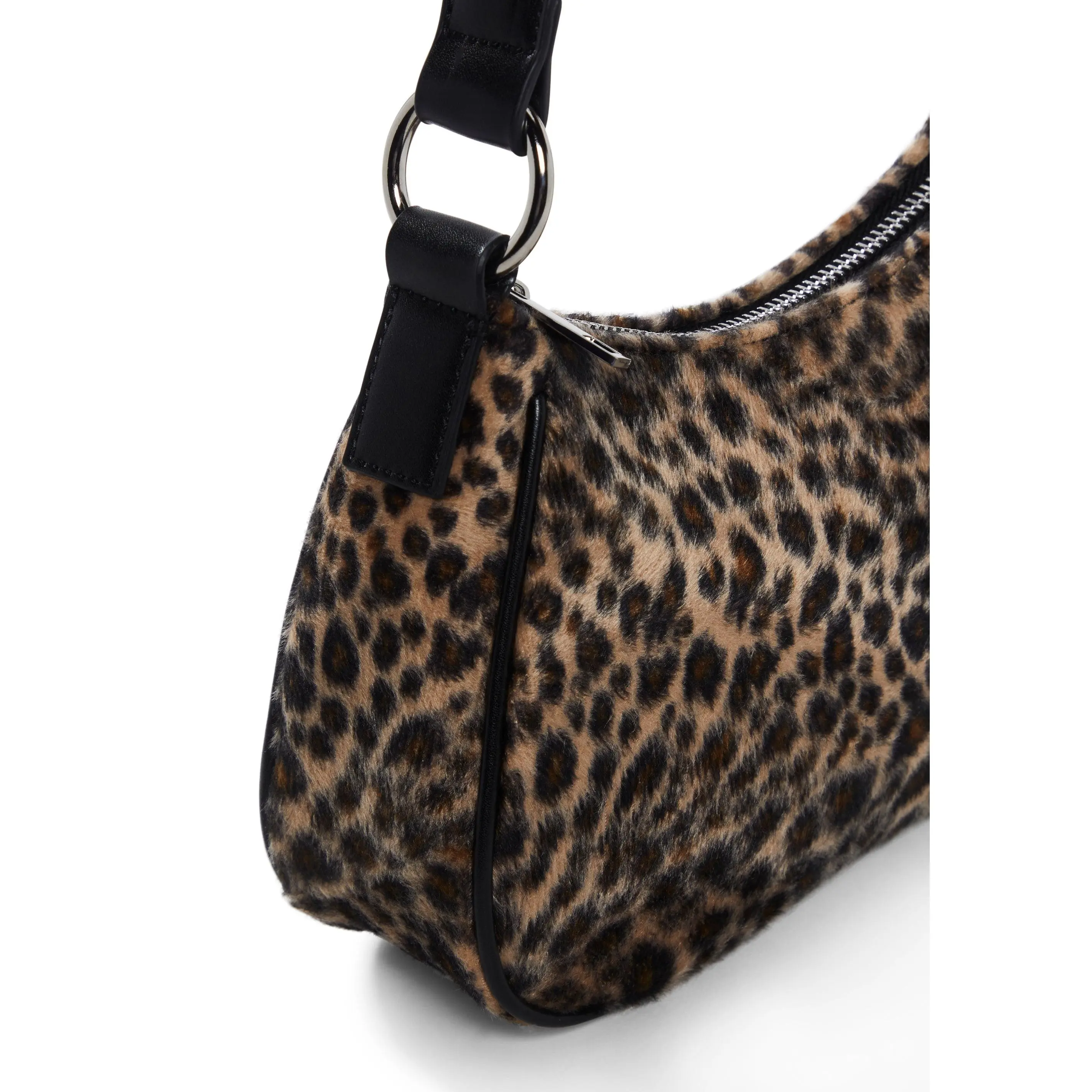 This bag has a faux fur construction with a vegan leather shoulder strap, o-ring hardware, and a top zipper closure.