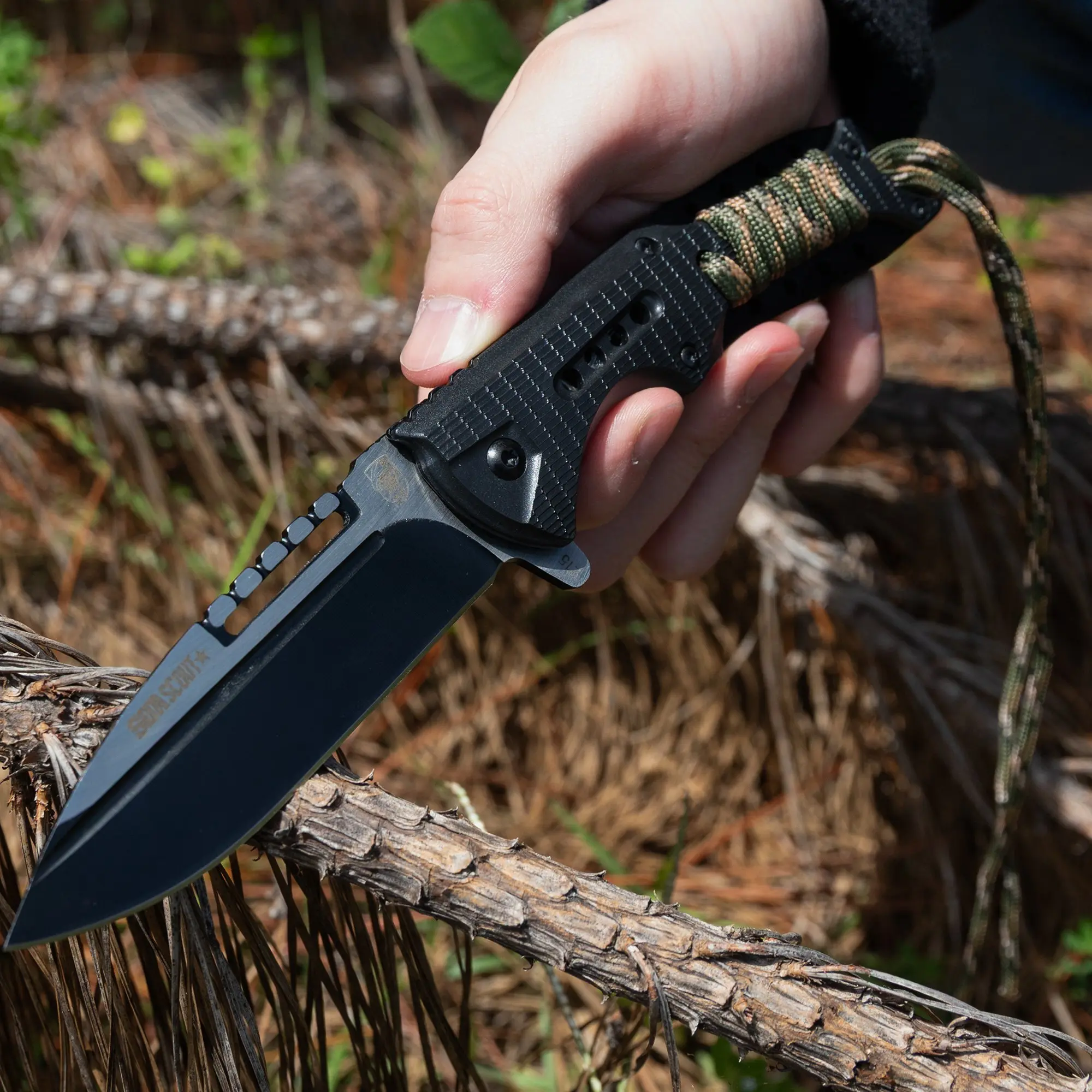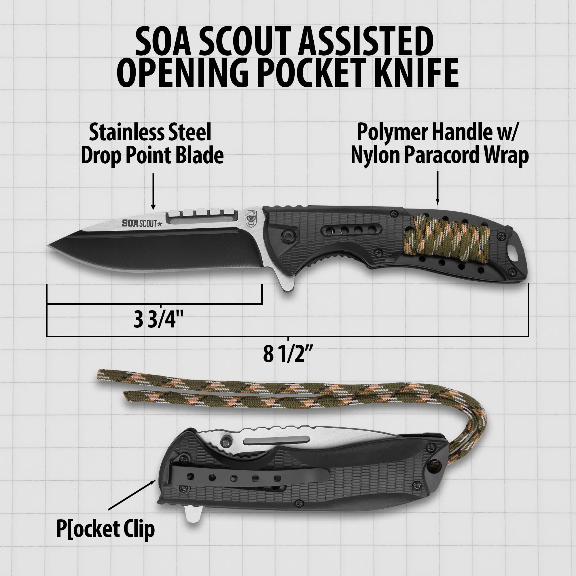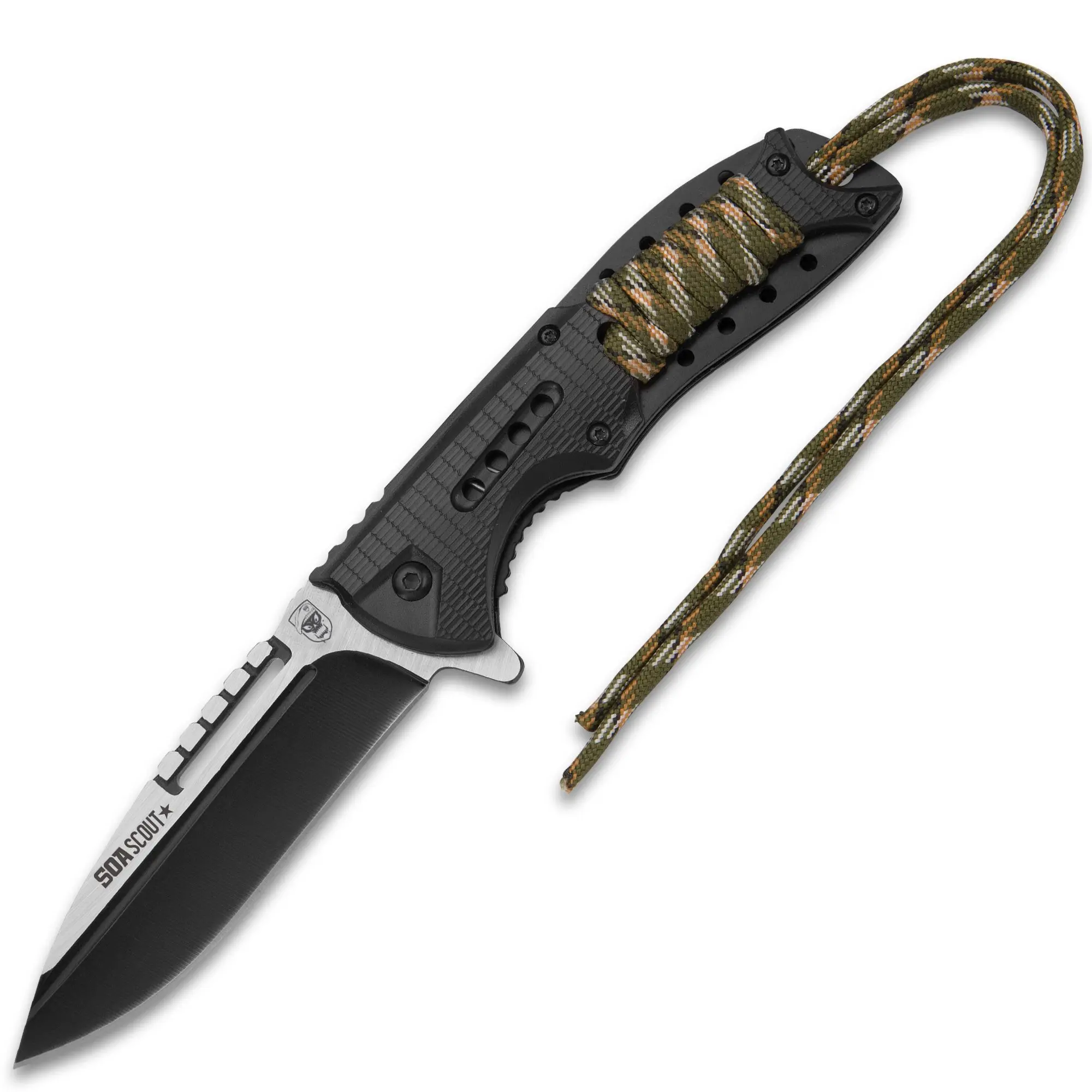 SOA Scout Assisted Opening Pocket Knife - Black with Camo Paracord Wrapping