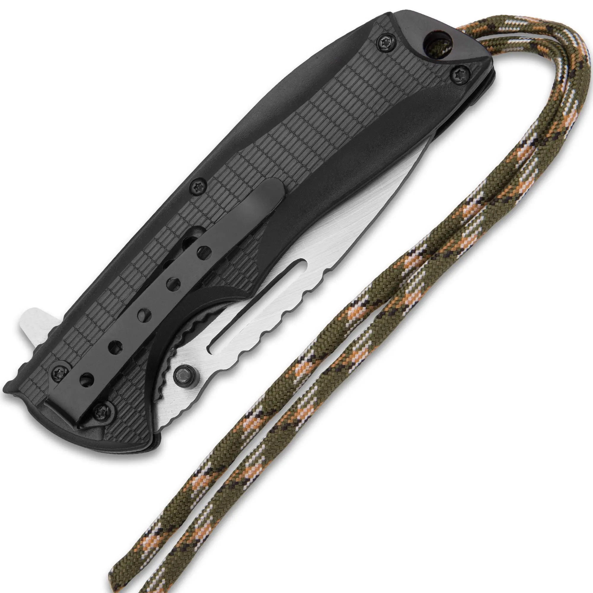Multitalented everyday carry with cool tactical styleRazor sharp 3 3/4"" stainless steel drop point bladeAssisted opening; flipper, ambidextrous thumbstudsTough polymer handle with nylon paracord wrappingParacord doubles as convenient lanyardPocket clip, liner lock, much moreClosed length: 4 3/4""