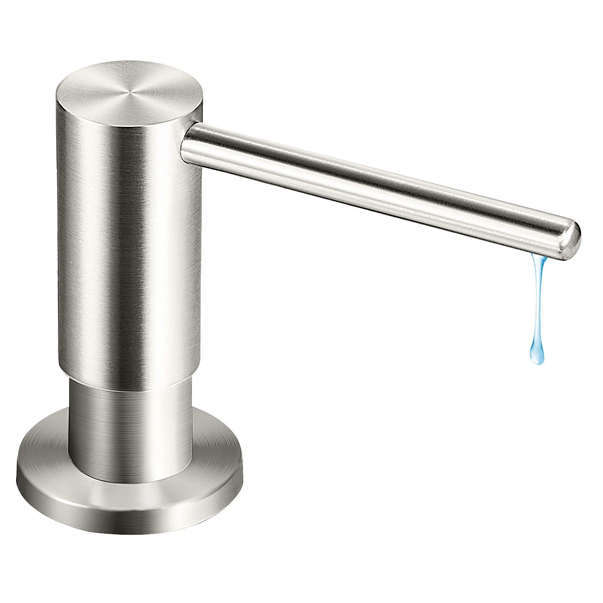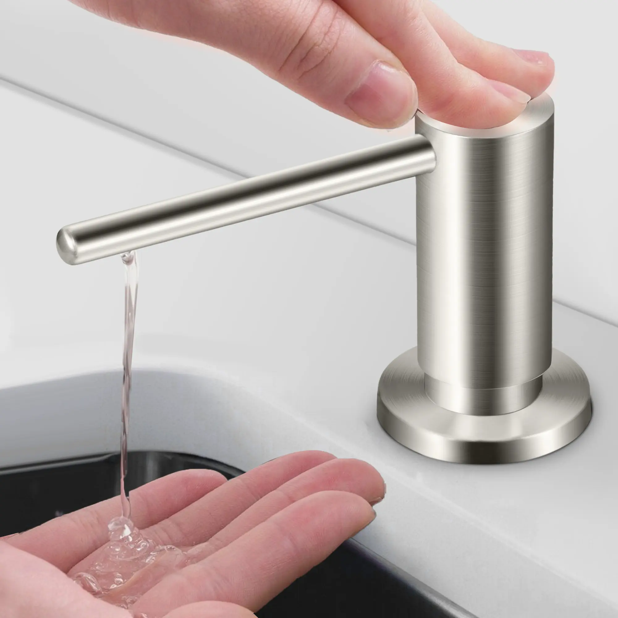 Our kitchen sink soap dispenser is made of Brushed Nickel stainless steel on the outside, which has been treated with brushed nickel to prevent decay and rust; The under counter soap dispenser for kitchen sink is suitable for most countertops (granite, stainless steel, wood glass and others
