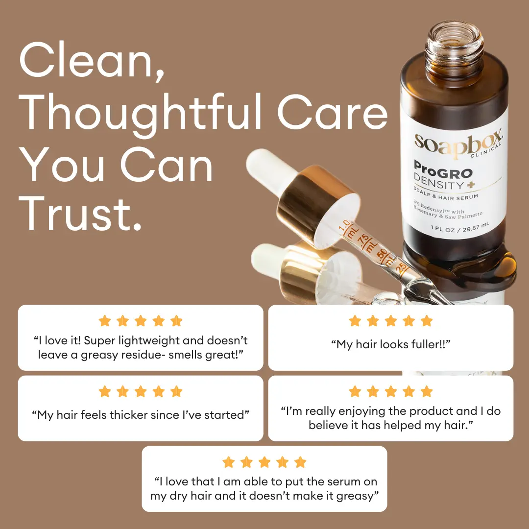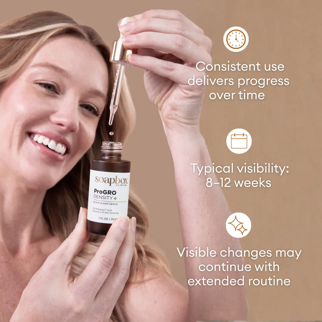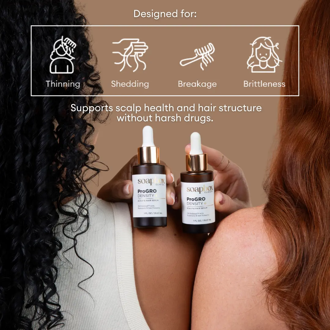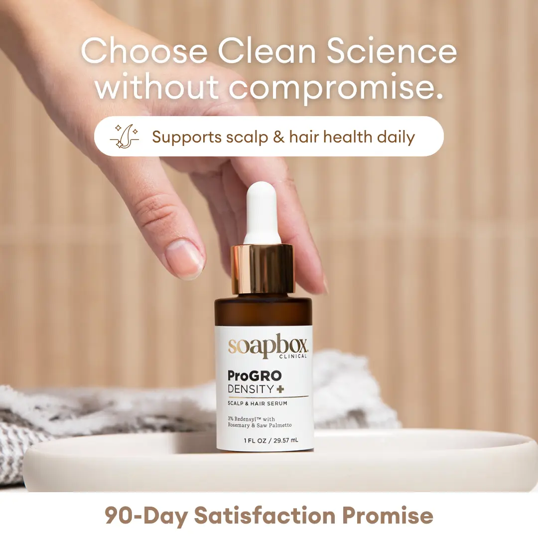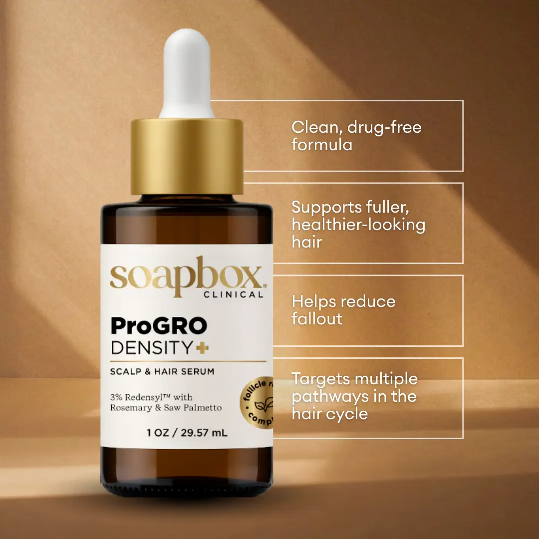 Experience targeted daily scalp care with Soapbox ProGRO Density+ Hair & Scalp Serum. Designed as a simple leave-on treatment, this lightweight formula supports healthier-looking, thicker, fuller hair while fitting easily into your routine. Powered by Soapbox’s proprietary VitaGRO Complex, it combines clinically studied ingredients with botanical extracts to support scalp health over time.