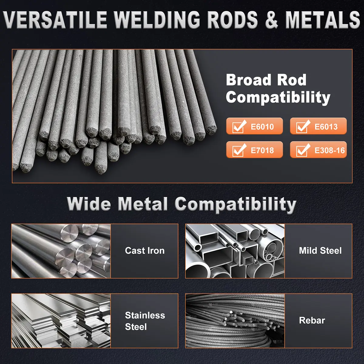 Ideal for:Metal repair & fabrication;Automotive welding jobs;DIY projects at home;Welding various materials depending on the rods used