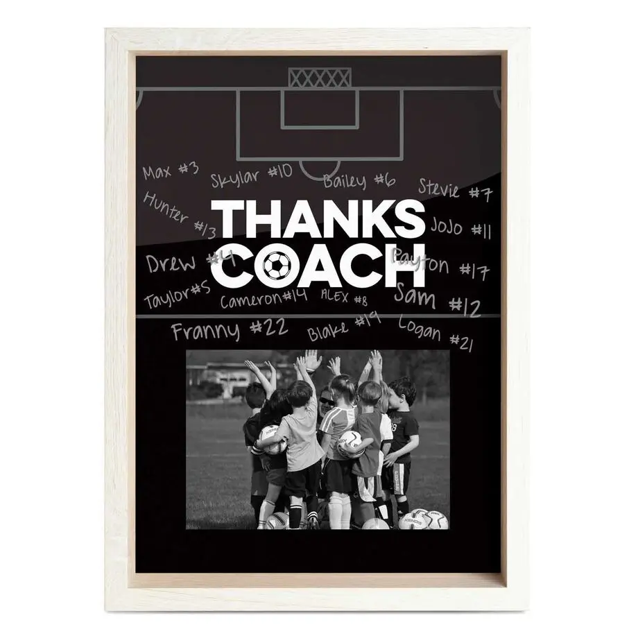 Our Premier Soccer Frame features a unique high quality printed soccer design on glass, that compliments any photo, making it the perfect end of season gift for that special coach. Players will love adding in that extra sentiment to the glass by autographing their names and #'s. This 12" x 9" frame will capture that one treasured free kick moment in a horizontal 4" x 6" photo. Best of all, you can showcase your frame like a shadow box by displaying it on an office desk or hanging it on a wall. This frame exemplifies all the beauty having a glass cover, durable wood-like resin texture, and an autograph feature to write in your own special touch. Show admiration to your coach for a striker season. This one of a kind frame truly is the best gift you can give and an excellent soccer keepsake.