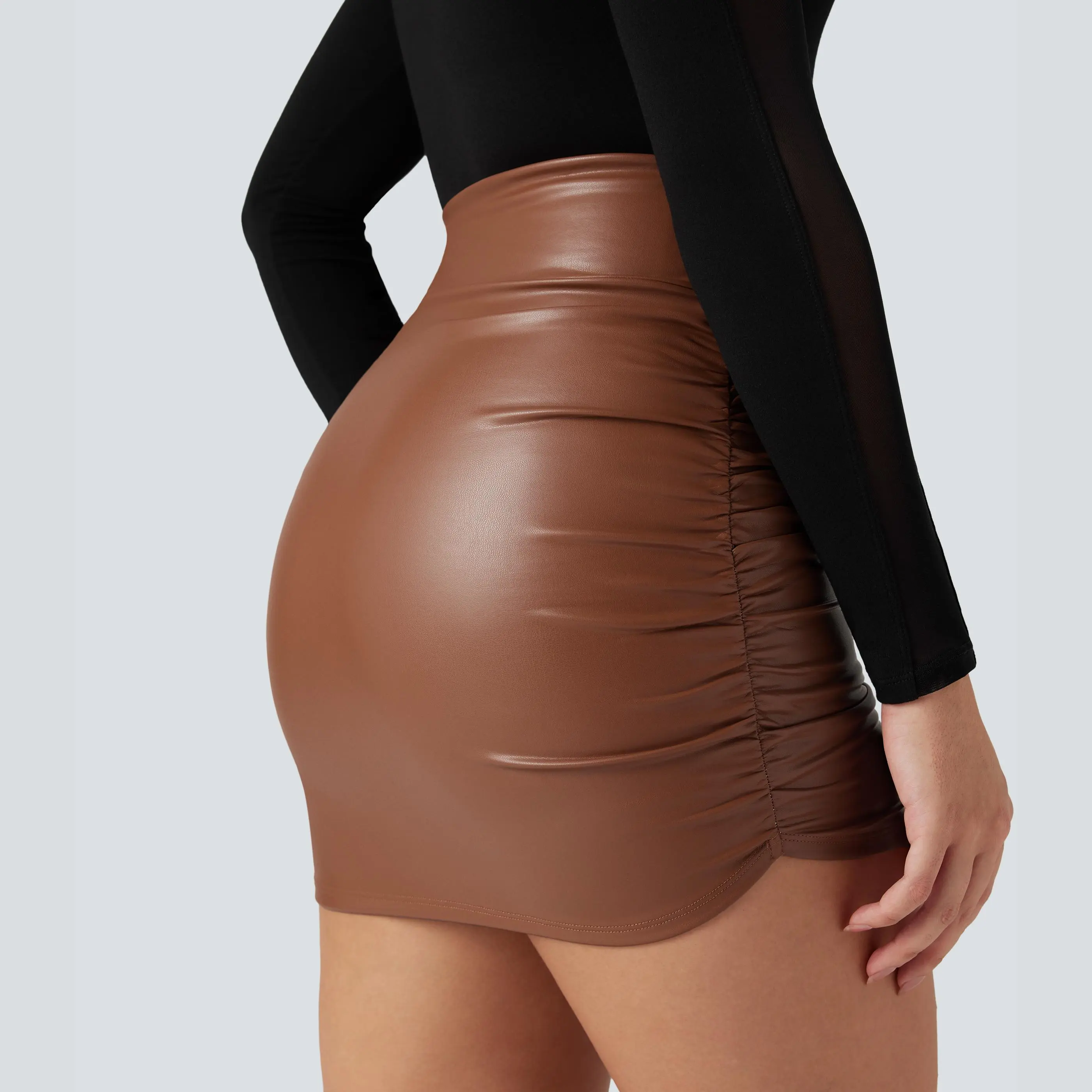 Top notch, faux, leather, soft, stretchy, burnt orange caramel With black shaper shorts it hugs in all the right places I would say it is true to size I would size up if you are more curvy such a beautiful fall staple!