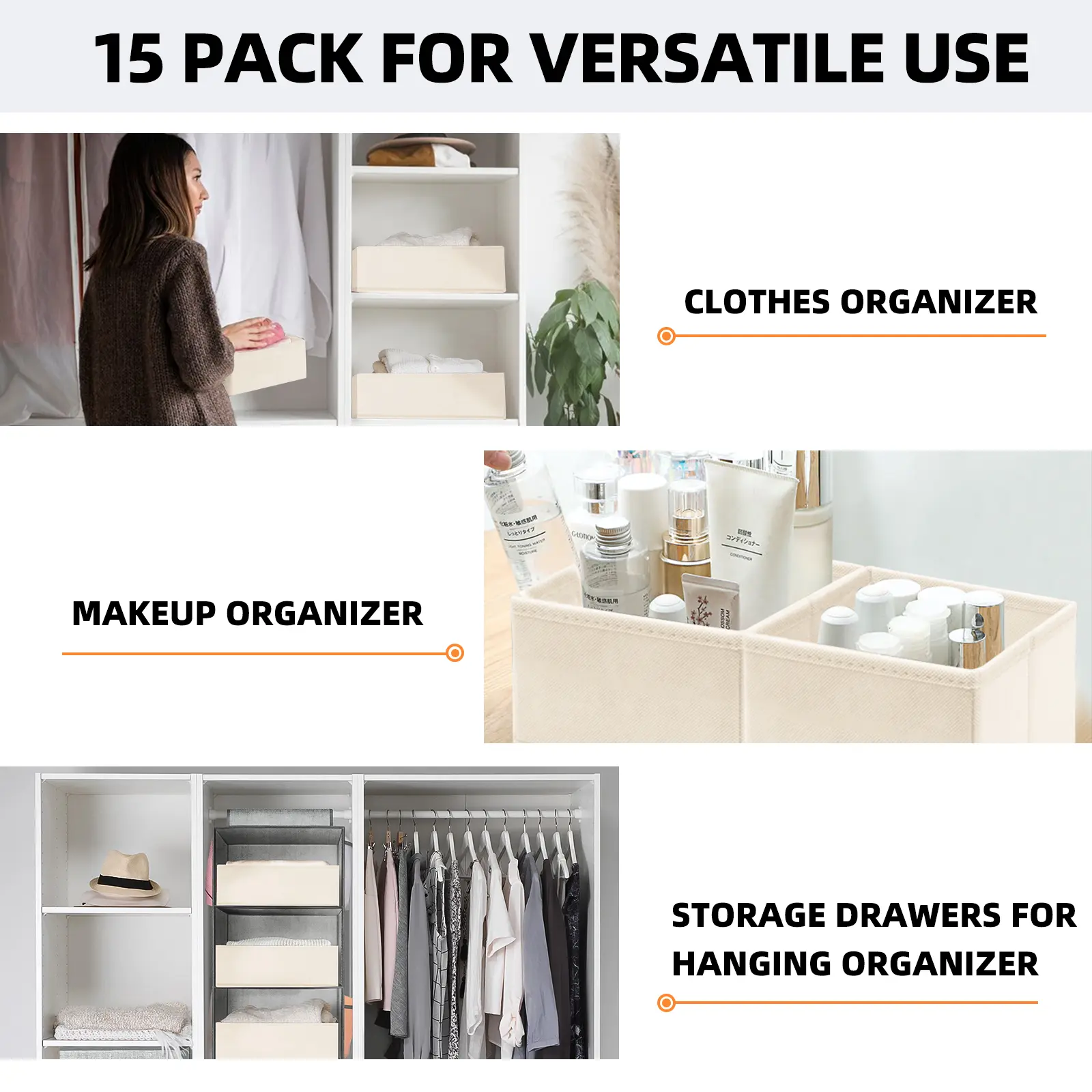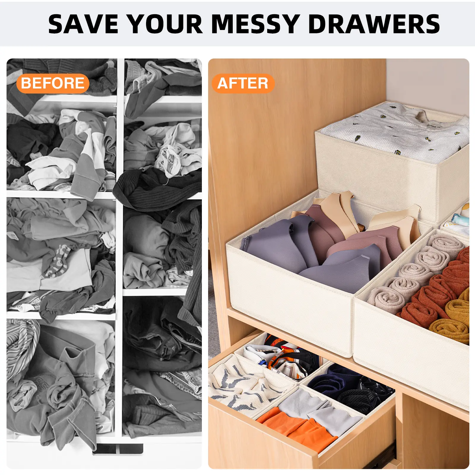·【MULTI-USE】These collapsible storage bins could serve as clothes organizer, also storage drawers for hanging closet organizers, storage baskets for shelf, or makeup drawer organizer, even Christmas ornament organizers. With 3 different sizes, these drawer dividers for clothes are perfect for clothes, sock, underwear, bra, scarves, shirt, pants, belt, ties, bikini, diaper, perfume and more.