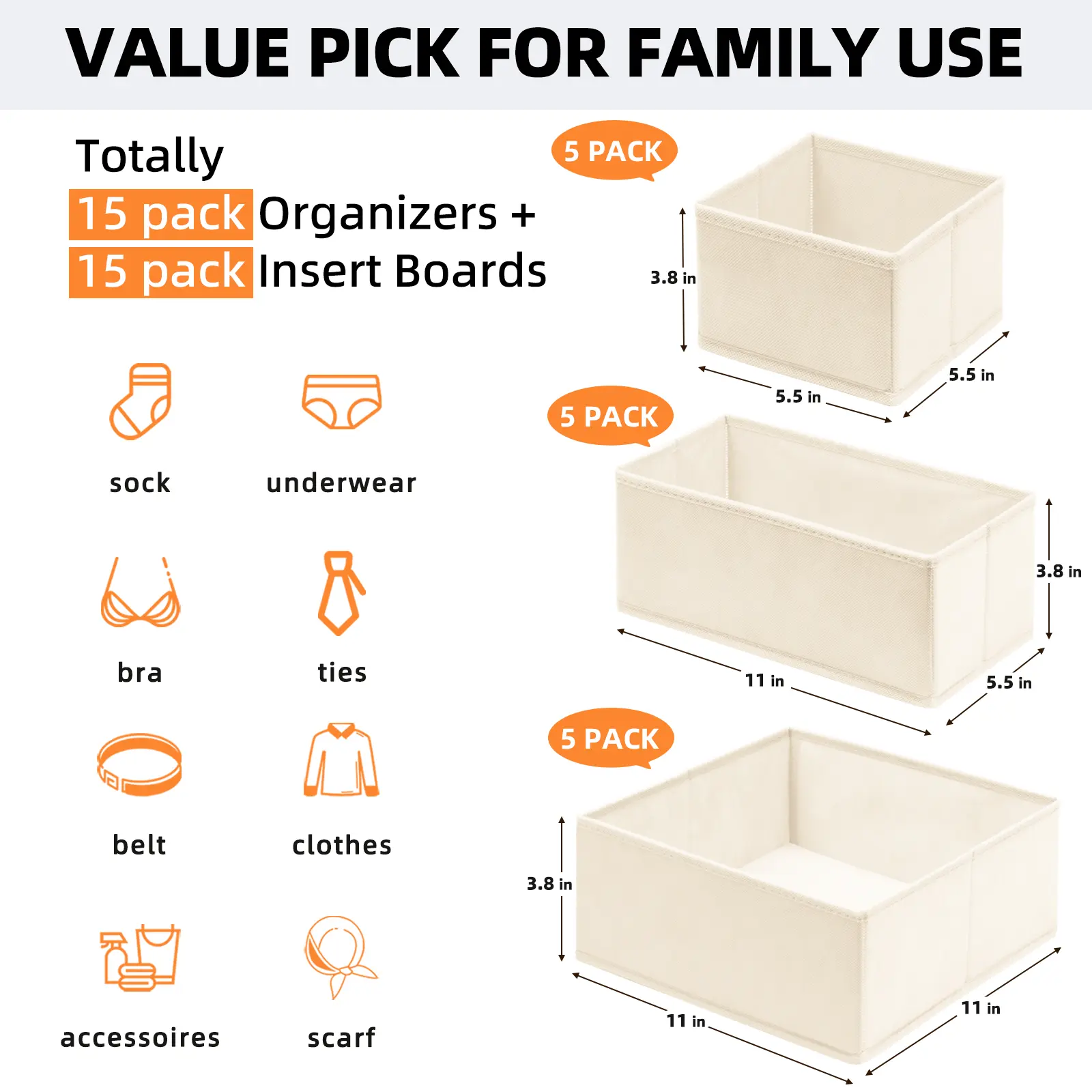 ·【PERFECT FIT WITH DRAWER】Measuring 3.8"H, these drawer dividers could fit with all your drawers, even stack in the deep drawers. Come with 15 pack dresser drawer organizers, you could make full use of them to organize your drawer and make your room tidy and clean. Great choice for your bedroom, college room, nursery, RV closet wardrobe. 5 Large square storage boxes (11"x11"x3.8"), 5 Medium container (11"x5.5"x5") and 5 Small bins (5.5"x5.5"x3.8").