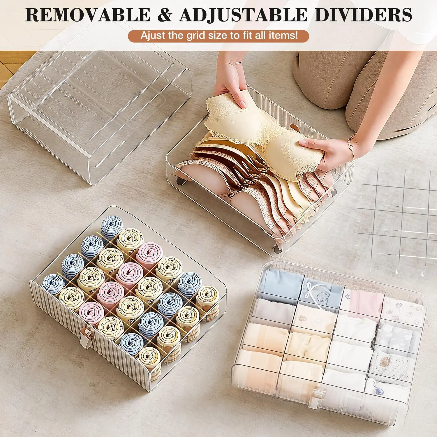 ·REMOVABLE DIVIDERS:Adjust to all items!Keep dividers for short socks/underwear, or remove some for bras/baby onesies.No need for multiple organizers-1 box handles your family’s small-item storage.Perfect for tiny trinkets and bulkier intimates.
