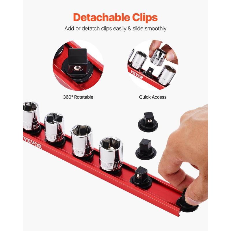 ·360° Rotating Clips: Adjustable rail clips on this socket organizer rail set rotate freely, giving you quick access to tools from any angle, whether positioned horizontally or vertically.
